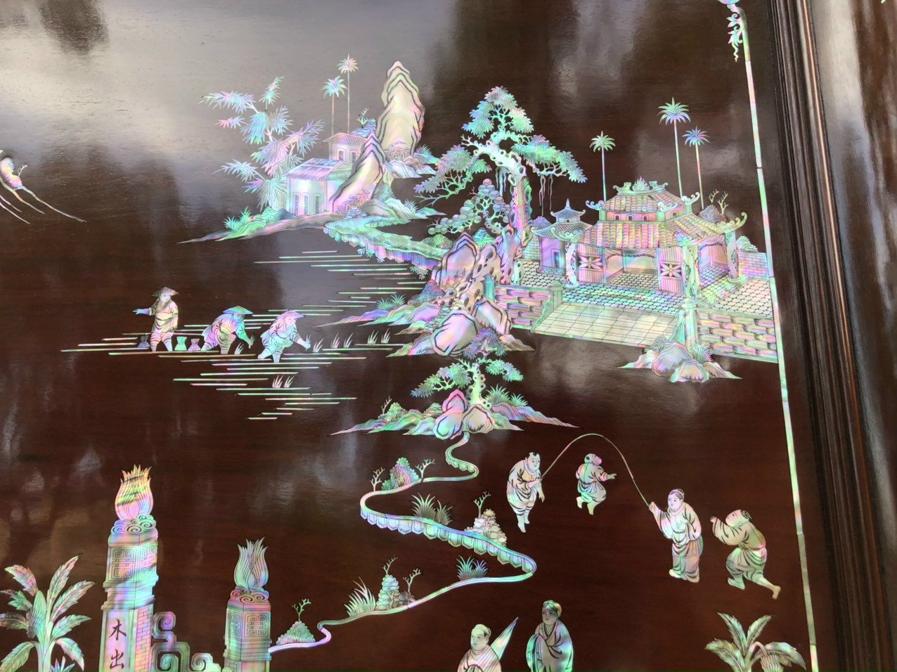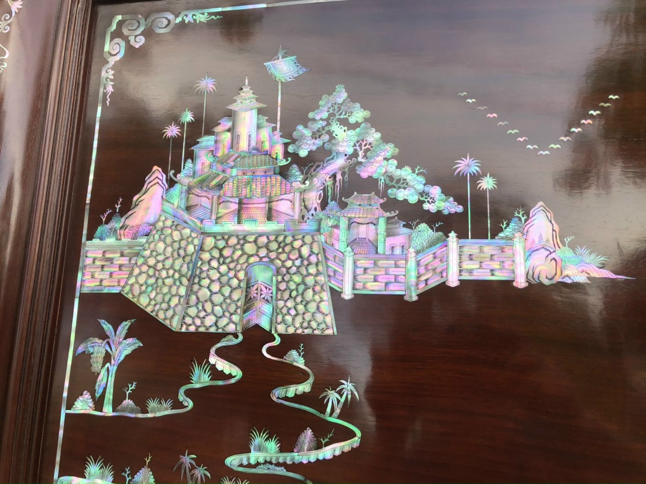 _ Tranh vinh quy bái tổ được cắt tỉa từng chi tiết xà cừ ốc đỏ ,lặp ghép vào với nhau vô cùng công phu, tinh sảo ,kỳ công .Đi hầu hết tất cả mọi đường nét đều được gọt tỉa chỉnh sửa hoàn toàn bằng tay thủ công .Đồng thời ván tấm gỗ gụ được kiểm định kỹ lưỡng như cho vào tắm nước vôi ,rồi cho vào sấy gỗ khô kiệt ,Mục đích trống dập nứt vênh mo ,mối mọt ,Kết hợp với trà nhám đánh ,giấy giáp nhiều lần ,sờ mát lạnh ,song rồi nhuộm mầu mận chín đánh vétly làm mầu mận chín giả cổ ,Tranh vinh quy được làm và hoàn thiện do bàn tay khối óc tài hoa ,Từ những người thợ giàu kinh nghiệm ,cũng như các nghệ nhân có tay nghề cao trong làng nghề truyền thống .Chính vì thế tranh vinh quy bái tổ đã đáp ứng đầy đủ những tiêu trí ( Đẹp bền rẻ ) Thẩm mỹ nghệ thuật với chất lượng hoàn hảo