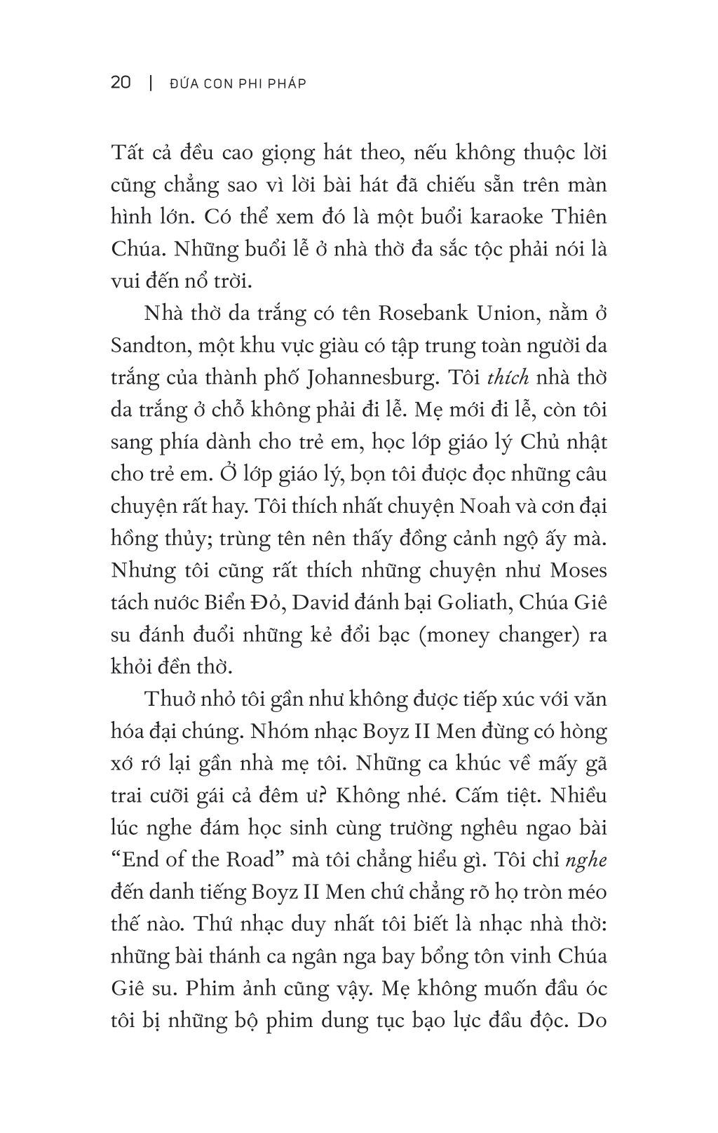 Quyển sách là tập hợp những câu chuyện hài hước, hấp dẫn, chứa đầy tính nhân văn sâu sắc. Dù phải ăn sâu bọ trong những ngày khốn khó, dù bị ném khỏi một chiếc xe đang chạy để thoát khỏi lũ người định bắt cóc, hay đơn thuần là cố gắng sống sót vượt qua nỗi khổ hẹn hò chốn học đường, Trevor vẫn thắp sáng thế giới hiếu kỳ của m.ình bằng nét dí dỏm sắc sảo cùng lòng trung thực bất biến. Những câu chuyện riêng lẻ cùng dệt thành một bức chân dung sống động về một cậu bé từng bước trưởng thành giữa một thế giới điêu tàn vào một thời kỳ biến loạn, hành trang trên người chỉ có tính hài hước khôn lanh cùng tình thương bao la người mẹ dành cho cậu.