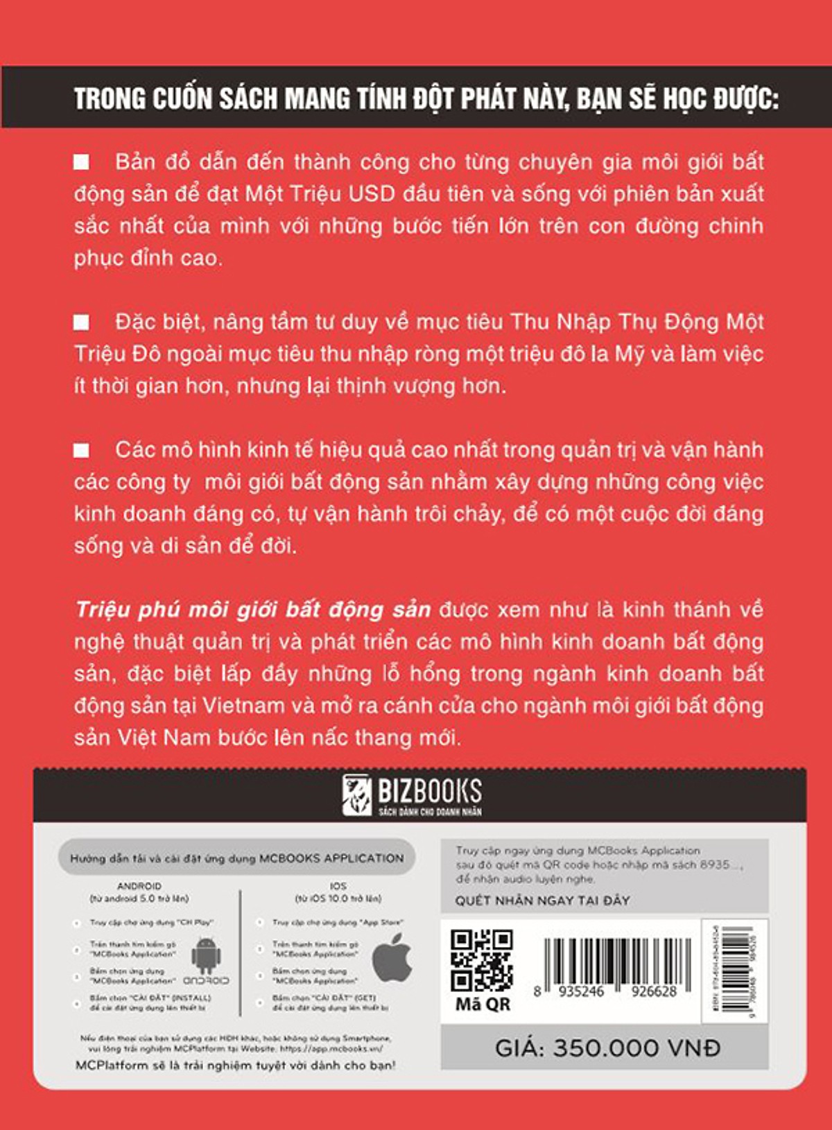 Mua tại TiktokNghề bất động sản – lựa chọn hoàn hảo cho bất kỳ người nào có máu kinh doanh và nhiều tham vọng Với chi phí khởi nghiệp tương đối thấp và không có mức trần cứng nhắc giới hạn thu nhập, nghề bất động sản dường như là lựa chọn hoàn hảo cho bất kỳ người nào có máu kinh doanh và nhiều tham vọng. Trong ngành này, bạn tự định ra hạn mức cho mình. Cách tiếp cận, khả năng và niềm đam mê môi giới bất động sản sẽ là những nhân tố quyết định lớn nhất cho thành công của bạn. Với “Triệu phú môi giới bất động sản”, bạn sẽ được trả lời câu hỏi quan trọng nhất mà bất kỳ ai làm môi giới bất động sản cũng có thể đã từng tự hỏi mình: “Làm thế nào tôi, với tư cách là người môi giới bất động sản, có thể tăng thu nhập của mình lên đến mức cao nhất có thể?” Trong cuốn sách này, tác giả sẽ trình bày với bạn cách suy nghĩ giống như một Triệu phú môi giới bất động sản. Sau đó, chúng tôi sẽ chỉ cho bạn biết, từng bước một, cách kiếm được một triệu đô la thu nhập ròng mỗi năm. Cuối cùng, chúng tôi sẽ chỉ ra con đường phải đi để nhận được một triệu đô la thu nhập thụ động(1) Triệu phú môi giới bất động sản được xem như là kinh thánh về nghệ thuật quản trị và phát triển các mô hình kinh doanh bất động sản, đặc biệt lấp đầy những lỗ hổng trong ngành kinh doanh bất động sản tại Việt Nam. Trên thế giới cũng như tại Việt Nam, chưa có chuyên gia nào như Gary Keller nói rõ và chi tiết về từng bước xây dựng và tăng trưởng đạt đến những thành công vang dội như vậy trong Triệu phú môi giới bất động sản. Triệu phú môi giới bất động sản được viết riêng cho những người có tinh thần làm việc tận tụy và dám mạo hiểm để trở thành những người tiên phong trong lĩnh vực kinh doanh của mình – sách này dành tặng riêng cho các chuyên gia môi giới bất động sản ở khắp mọi nơi trên thế giới. “Sách Đỏ: của chuyên gia bất động sản khắp nơi trên thế giới Trong cuốn sách mang tính đột phá này, bạn sẽ học được: