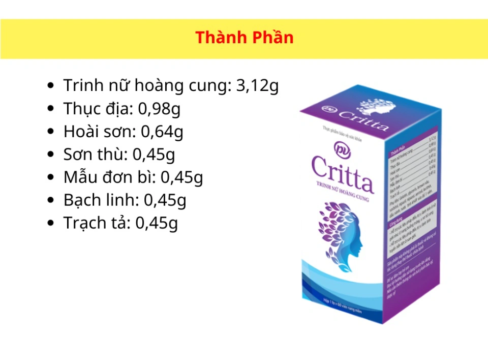 Trinh nữ hoàng cung Critta - Hộp 60 viên 1. Công dụng: - Hỗ trợ hạn chế sự phát triển của u xơ lành tính như: U xơ tử cung, u xơ tuyến tiền liệt.