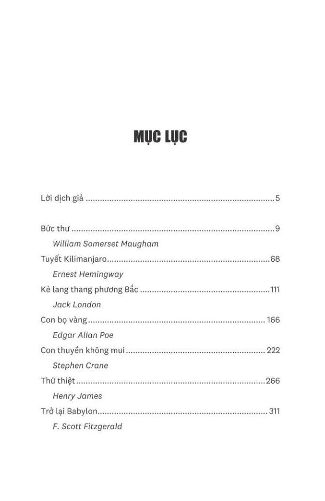 Tuyển tập truyện ngắn của mười tên tuổi lớn trong nền văn học Anh - Mỹ, những người có thể coi là một đỉnh cao, tỏa bóng và để lại ảnh hưởng lên rất nhiều thế hệ nhà văn sau này: