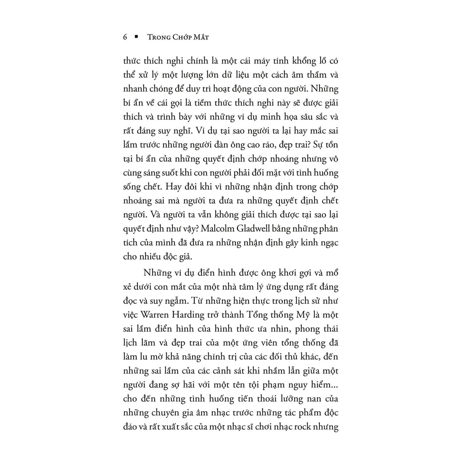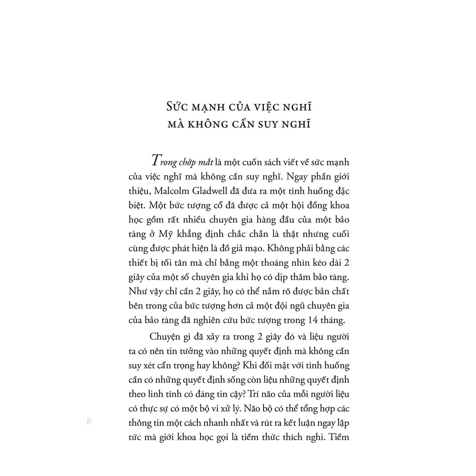 Trong chớp mắt là một cuốn sách chiến lược viết về sức mạnh của việc nghĩ mà không cần suy nghĩ, về những quyết định đưa ra chỉ trong một cái chớp mắt thực sự không hề tầm thường như mọi người vẫn nghĩ. Vì sao một số người luôn là những người quyết định sáng suốt, trong khi số khác lại luôn lầm lẫn, quẩn quanh… Tại sao một số người hành động theo bản năng của họ và chiến thắng, một số người lại luôn kết thúc bằng sai lầm. Não của chúng ta thực sự hoạt động thế nào: trong công sở, trong lớp học, trong bếp và phòng ngủ… Và vì sao những quyết định đúng đắn nhất lại thường là những quyết định không thể lý giải rõ ràng cho người khác.