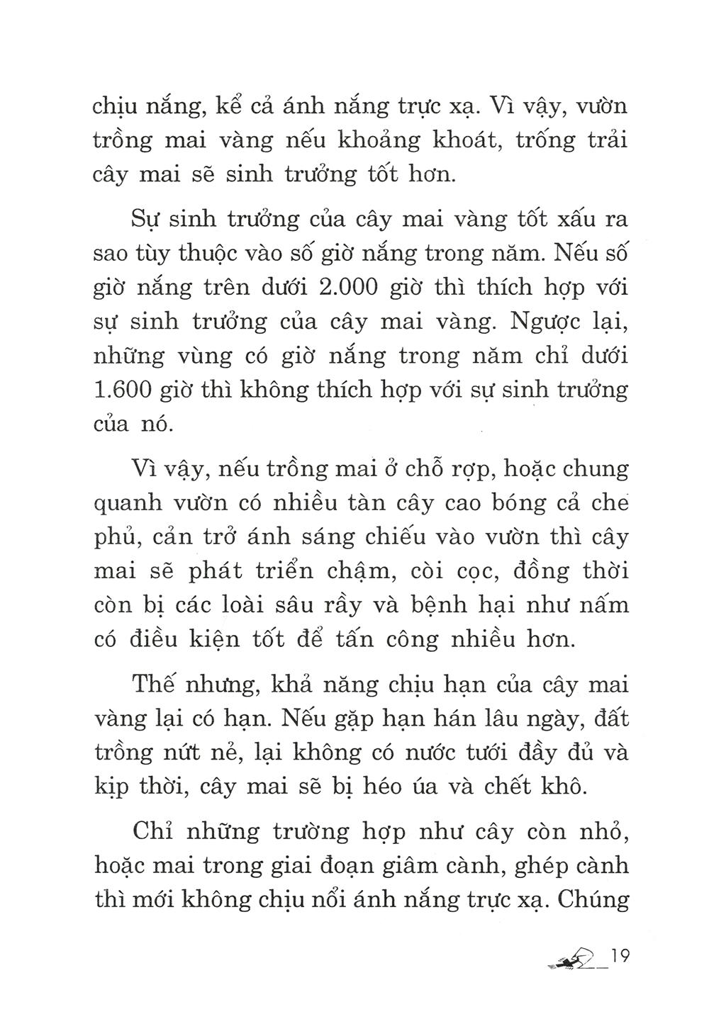Muốn trồng được những cây mai đẹp đạt giá bán cao ngất ngưỡng như vậy, người làm vườn, tức là nghệ nhân hoa kiểng phải dày công chăm sóc tưới bón, và hằng ngày quan tâm đến việc phòng trị các loài sâu rầy và bệnh hại cho cây. Cuốn sách giới thiệu về kỹ thuật trồng, cách chăm sóc, tưới nước, phòng trừ côn trùng - bệnh hại cho cây mai.