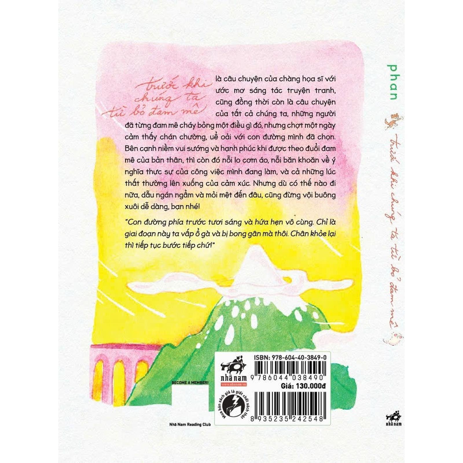 Trước khi chúng ta từ bỏ đam mê là câu chuyện của chàng họa sĩ với ước mơ sáng tác truyện tranh, cũng đồng thời còn là câu chuyện của tất cả chúng ta, những ngườ đã từng đam mê cháy bỏng một điều gì đó, nhưng chợt một ngày cảm thấy chán chường, uể oải với con đường mình đã chọn. Bên cạnh niềm vui sướng và hạnh phúc khi dudojc theo đuổi đam mê của bản thân, thì còn đó nỗi lo cơm áo, nỗi băn khoăn về ý nghĩa thực sự của công việc mifh đang làm và cả những lúc thất thường lên xuống của cảm xúc. Nhưng dù có thế nào đi nữa, dẫu ngán ngẩm và mệt mỏi đến đâu, cũng đừng vội buông xuôi dễ dàng, bạn nhé! "Con đường phía trước tươi sáng và hứa hẹn vô cùng. Chỉ là giai đonạ này ta vấp ổ gà và bị bong gân mà thôi. Chân khỏe lại thì tiếp tục bước tiếp chứ!"