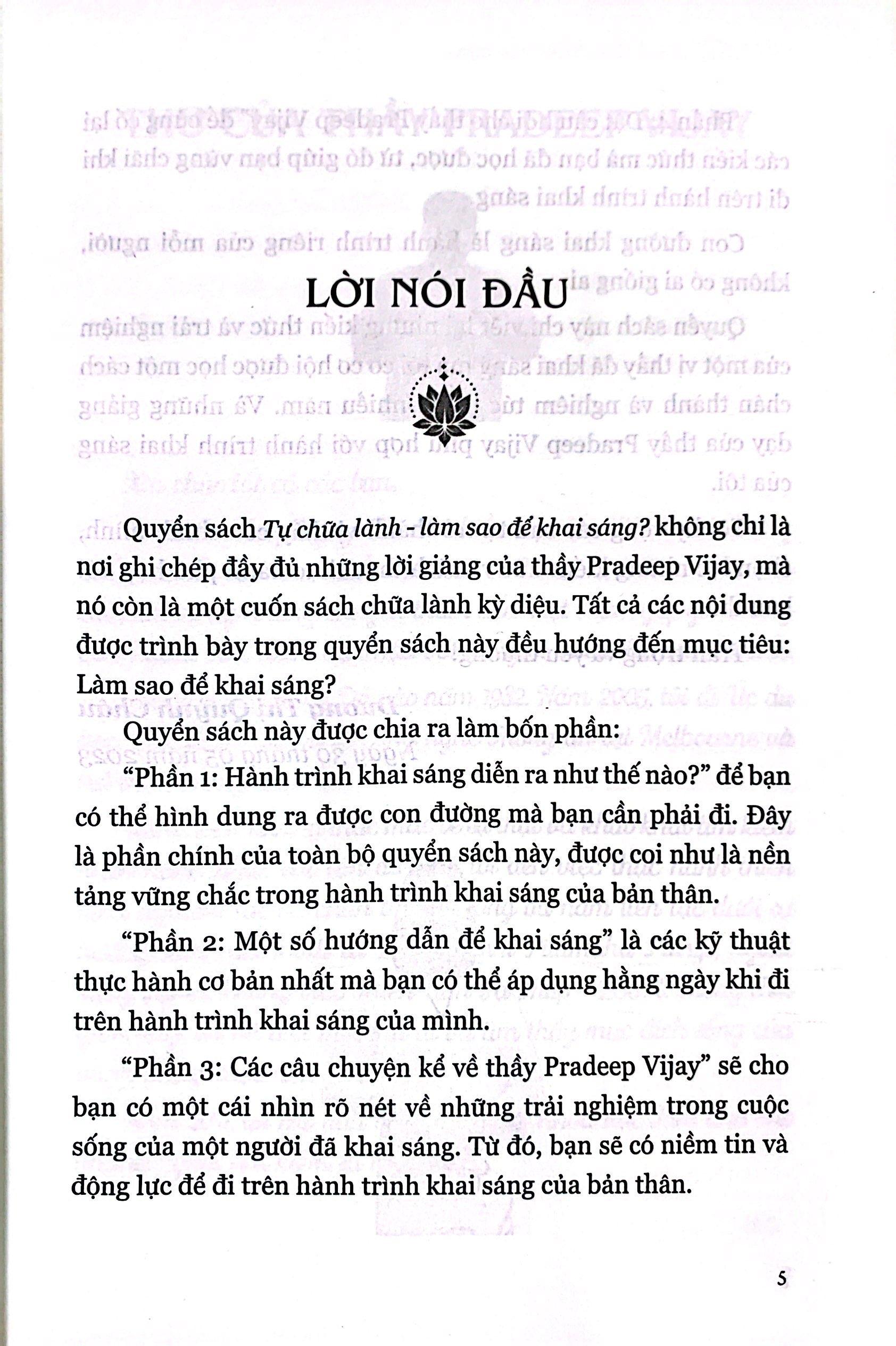 Quyển sách Tự chữa lành – làm sao để khai sáng? không chỉ là nơi ghi chép đầy đủ những lời giảng của thầy Pradeep Vijay, mà nó còn là một cuốn sách chữa lành kỳ diệu. Tất cả các nội dung được trình bày trong quyển sách này đều hướng đến mục tiêu: Làm sao để khai sáng.