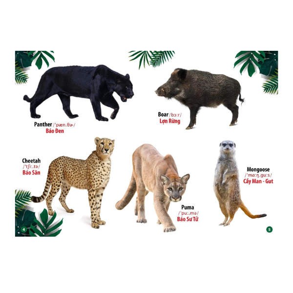 Thông qua các loài như: Gia súc, động vật hoang dã, động vật biể những bức ảnh sặc sỡ cùng các khung hình sống động sẽ tái hiện lại cuộc sống muôn loài trên Trái đất, đồng thời giúp bé phát triển kĩ năng quan sát, xây dựng vốn từ vựng tiêng Anh phong phú về động vật, giúp bé khám phá thế giới động vật muôn màu.