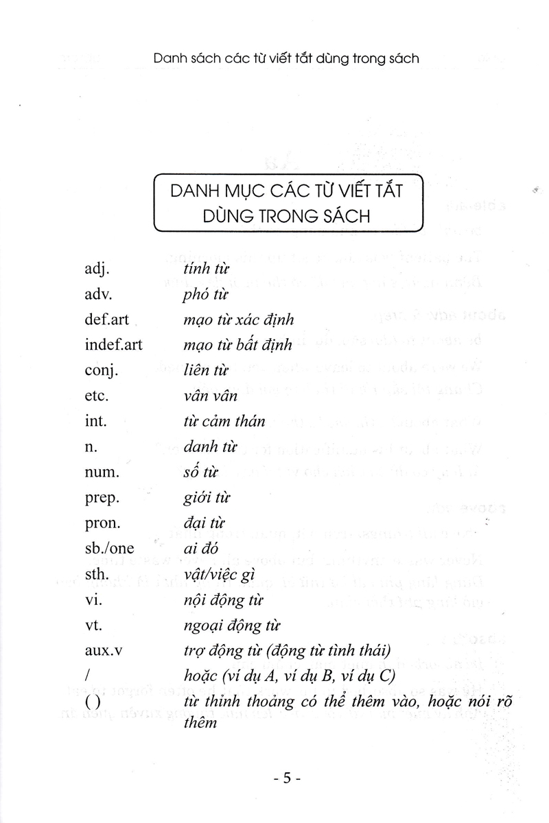 Sách bao gồm rất nhiều cụm từ mới và hiện đại, thường xuất hiện trong tiếng Anh - Anh và tiếng Anh - Mỹ. Các cụm từ được sắp xếp theo từ trung tâm (danh từ, động từ, tính từ và các thực từ khác) với ý nghĩa chuẩn xác, dễ hiểu, đồng thời có kèm theo các ví dụ sinh động để giúp người học dễ dàng vận dụng).
