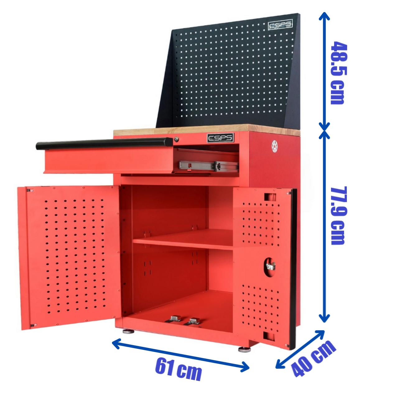 Tủ dụng cụ CSPS 61cm - 01 hộc kéo màu đỏ ván gỗ vách lưới 1.THÔNG SỐ CHUNG Kích thước đóng gói/ Package dimension: 62cm W x 43cm D x 78.5cm H Kích thước sản
