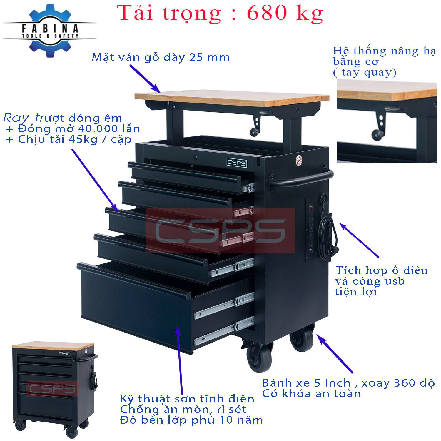Tủ dụng cụ CSPS 7 ngăn kéo, mặt ván gỗ và vách lưới chất lượng cao. THÔNG SỐ KỸ THUẬT 1 THÔNG SỐ CHUNG Kích thước sản phẩm: 76.4 cm Ngang x 46.2cm Sâu x 96