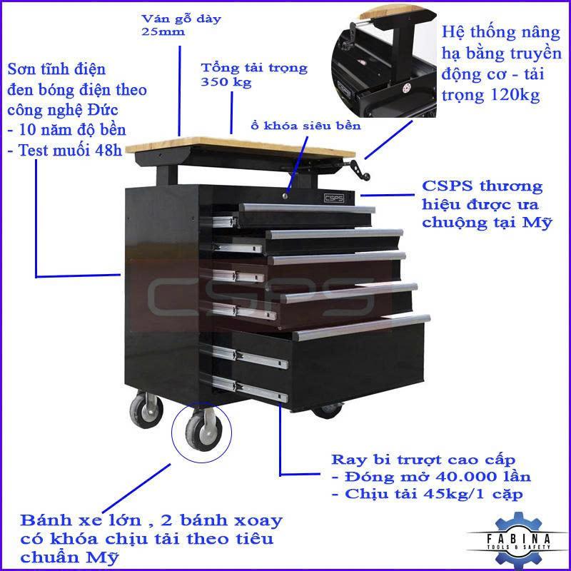Tủ dụng cụ CSPS 7 ngăn kéo, mặt ván gỗ và vách lưới chất lượng cao. THÔNG SỐ KỸ THUẬT 1 THÔNG SỐ CHUNG Kích thước sản phẩm: 76.4 cm Ngang x 46.2cm Sâu x