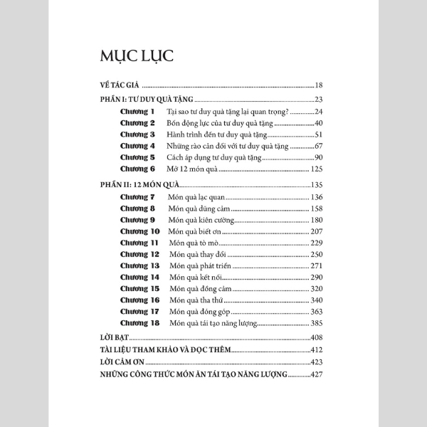 Trong phần II, ta sẽ khám phá 12 món quà:;Món quà lạc quan, dũng cảm, kiên cường, biết ơn, tò mò, thay đổi...;Bạn có thể đọc về những món quà này theo bất kì trình tự nào, tùy thuộc vào nhu cầu của bạn và điều quan trọng đối với bạn tại thời điểm đọc.;