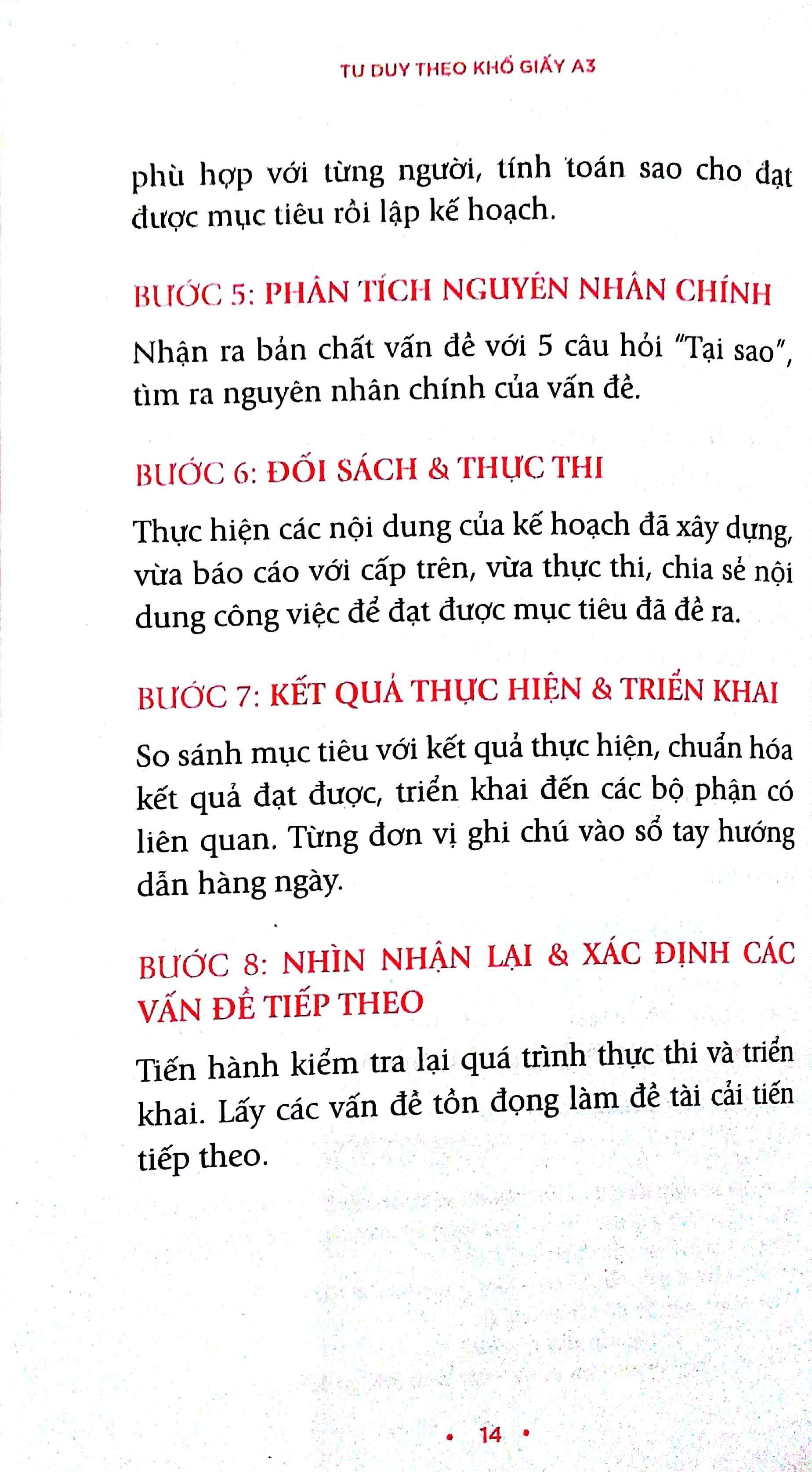 Đặc trưng của mô thức Báo cáo trên khổ giấy A3 mà Toyota áp dụng là quy trình 8 bước. Bao gồm: Đề tài; Bối cảnh thiết lập đề tài; Nắm bắt hiện trạng; Thiết lập mục tiêu; Phân tích nguyên nhân chính; Đối sách & thực thi; Kết quả thực hiện & triển khai; Nhìn nhận lại & xác định các vấn đề tiếp theo. Theo Sumie Ishii, khi soạn bảng báo cáo theo những bước này, người làm việc không chỉ nắm được nội dung ngay tức thì để làm căn cứ ra quyết định, mà còn giải quyết được nhiều vấn đề và quản lý các dự án liên quan dễ dàng hơn.