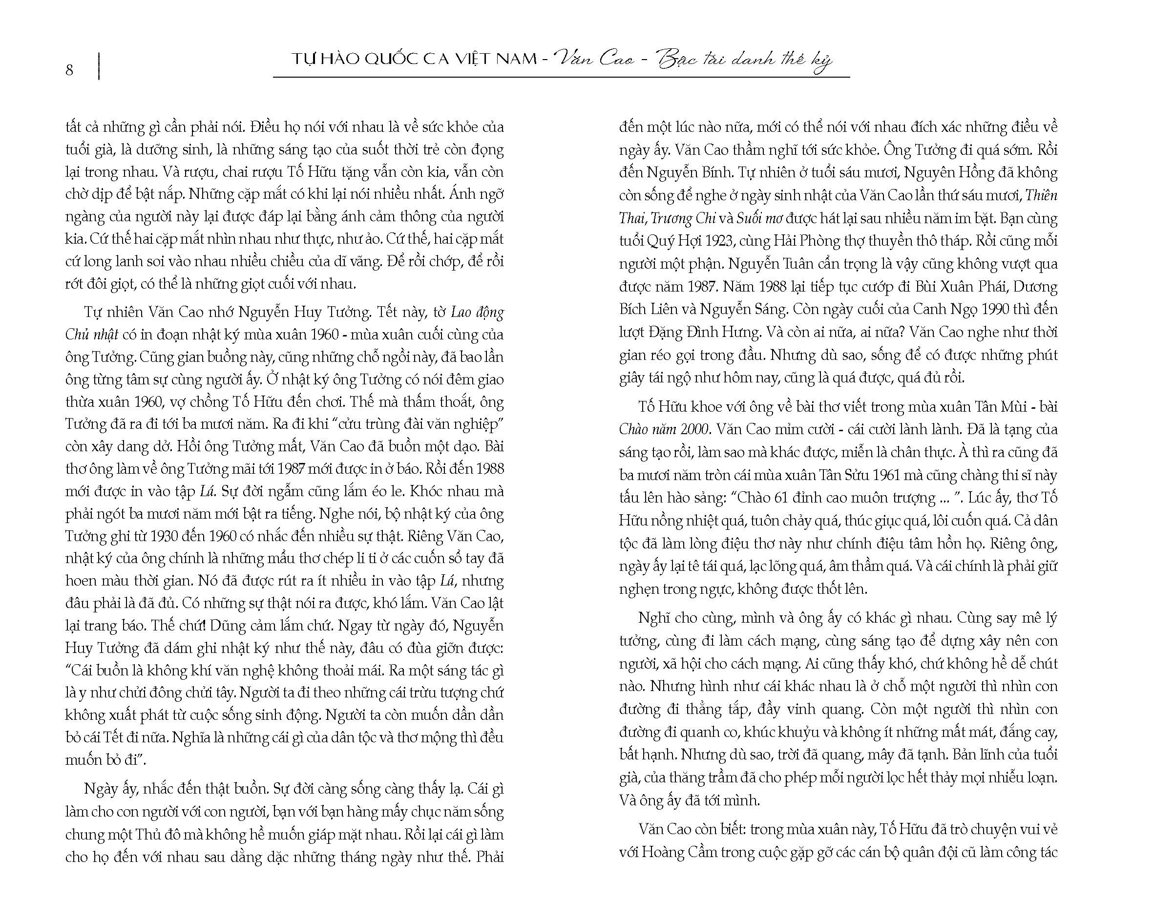 “TỰ HÀO QUỐC CA VIỆT NAM - VĂN CAO, BẬC TÀI DANH THẾ KỈ” như một cuốn tiểu sử - tiểu thuyết chân dung, một cuộc hành trình xuyên suốt cuộc đời sáng tạo nghệ thuật, tham gia cách mạng của nhạc sĩ, nhà thơ, họa sĩ Văn Cao. Tác giả cuốn sách là những người bạn văn nghệ gần gũi và có nhiều bài viết giá trị về cuộc đời và sự nghiệp của Văn Cao lúc sinh thời.