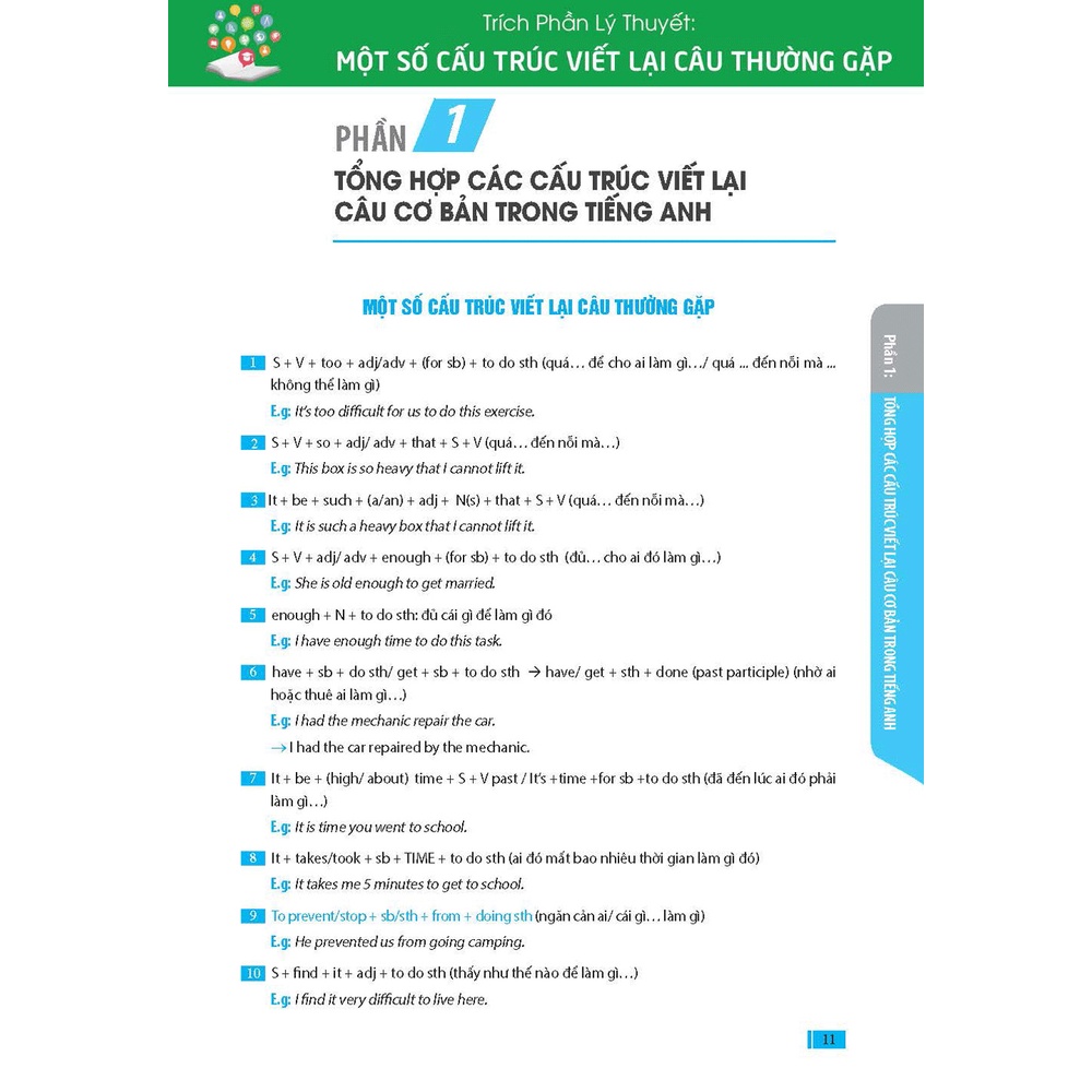 Là cuốn sách Viết lại câu Duy Nhất trên thị trường có lời giải Siêu chi tiết. Đáp án mỗi câu hỏi đều được trình bày theo cấu trúc: Câu Viết lại hoàn chỉnh - Cấu trúc ngữ pháp được sử dụng trong bài - Dịch nghĩa