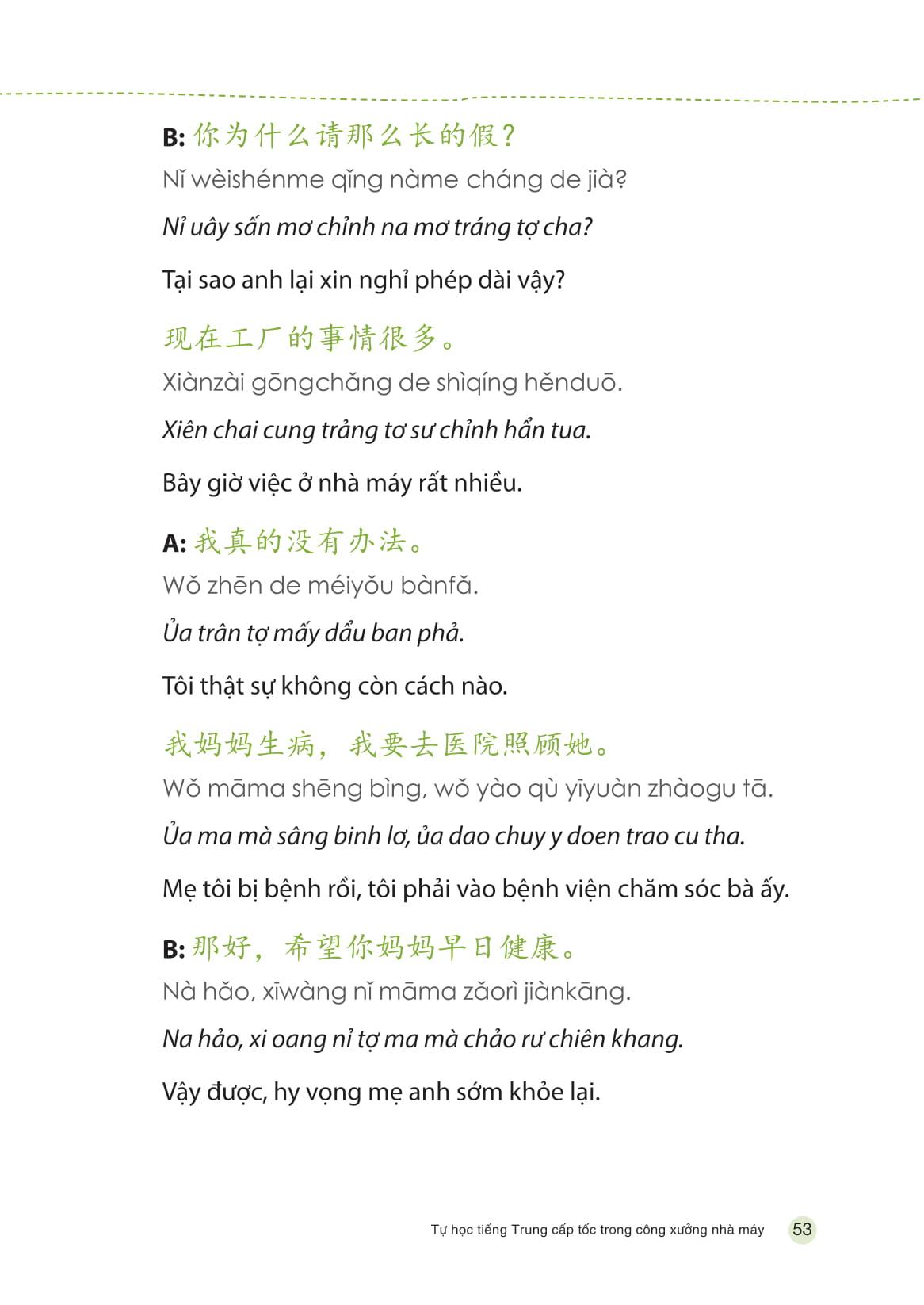 Cuốn sách “Tự học Tiếng Trung cấp tốc trong công xưởng, nhà máy” ra đời cũng vì mục đích đó. Với các chủ đề đa dạng, từ giao tiếp thông dụng tới giao tiếp theo chuyên ngành, cuốn sách sẽ phù hợp cho nhiều đối tượng khác nhau, đặc biệt là những người bận rộn muốn học tiếng Trung có trọng điểm, tiết kiệm thời gian và có thể ứng dụng ngay trong công việc.