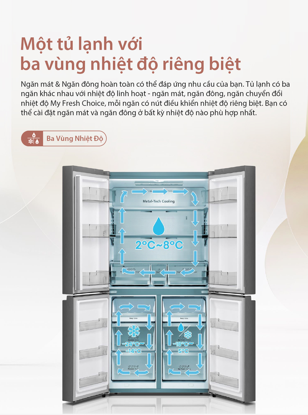 - Ba Vùng Nhiệt Độ: Ngăn mát & Ngăn đông hoàn toàn có thể đáp ứng nhu cầu của bạn. Tủ lạnh có ba ngăn khác nhau với nhiệt độ linh hoạt - ngăn mát, ngăn đông, ngăn chuyển đổi nhiệt độ My Fresh Choice, mỗi ngăn có nút điều khiển nhiệt độ riêng biệt. Bạn có thể cài đặt ngăn mát và ngăn đông ở bất kỳ nhiệt độ nào phù hợp nhất.