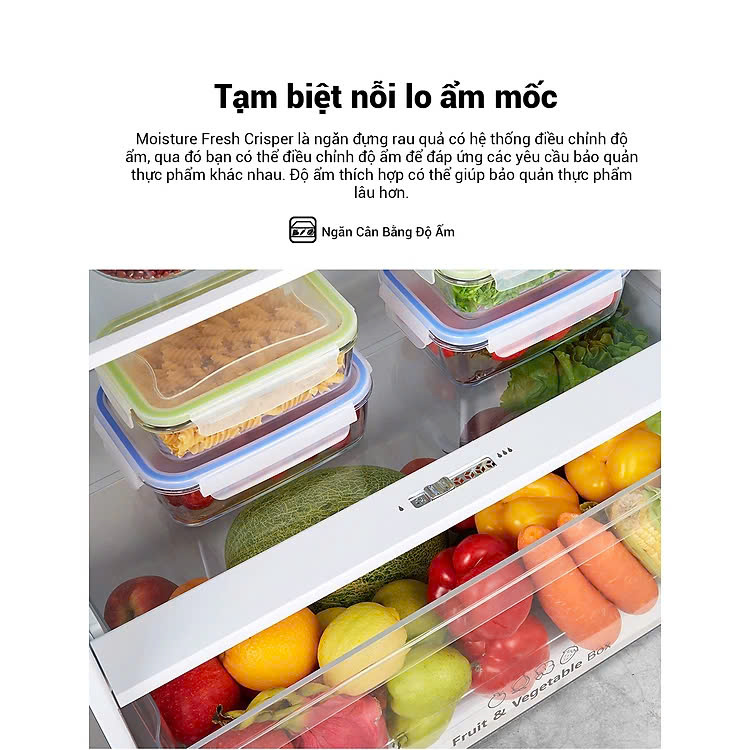 - Diệt Khuẩn Khử Mùi Cả Ngăn Mát Và Ngăn Đông, Tận Hưởng Luồng Khí Trong Lành: Ngăn Mát và Ngăn Đông được trang bị bộ lọc CCA chuyên dụng được thiết kế cho điều kiện nhiệt độ thấp, đảm bảo đạt được hiệu quả diệt khuẩn 99,99% và tỷ lệ khử mùi 93,2%, bảo vệ cho sức khỏe gia đình. Các phân tử nước được tạo ra duy trì độ ẩm của rau và trái cây đồng thời giảm lượng khí Ethylene, kéo dài độ tươi của rau quả bằng cách làm chậm quá trình chín. Ngăn Cân Bằng Độ Ẩm,Tạm Biệt Nỗi Lo Ẩm Mốc: Moisture Fresh Crisper là ngăn đựng rau quả có hệ thống điều chỉnh độ ẩm, qua đó bạn có thể điều chỉnh độ ẩm để đáp ứng các yêu cầu bảo quản thực phẩm khác nhau. Độ ẩm thích hợp có thể giúp bảo quản thực phẩm lâu hơn.