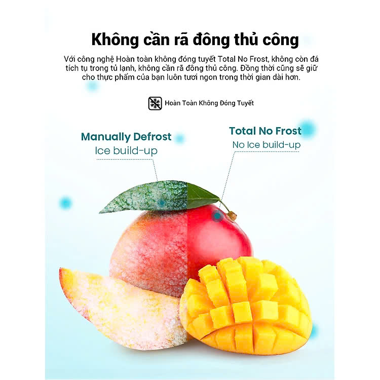 - Công nghệ Hoàn toàn không đóng tuyết Total No Frost, không còn đá tích tụ trong tủ lạnh, không cần rã đông thủ công. Đồng thời cũng sẽ giữ cho thực phẩm của bạn luôn tươi ngon trong thời gian dài hơn.