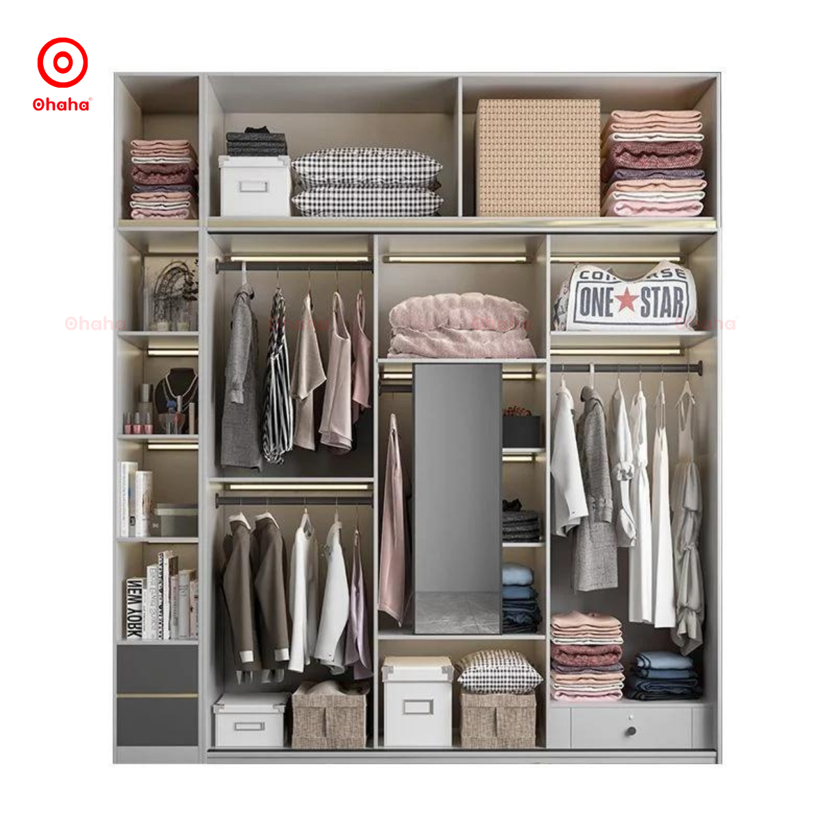 Bạn có thể lựa chọn tủ quần áo gỗ công nghiệp hiện đại Ohaha cánh lùa - CL021 với khối tủ nhiều ngăn kéo và khoang lưu trữ quần áo và các vật dụng cá nhân khác. Thiết kế thông minh của tủ quần áo gỗ công nghiệp ohaha có cánh lùa hiện đại tiết kiệm diện tích và an toàn khi mở mà còn cho phép tùy chỉnh theo ý muốn để phù hợp với nhu cầu sử dụng của mọi gia đình.