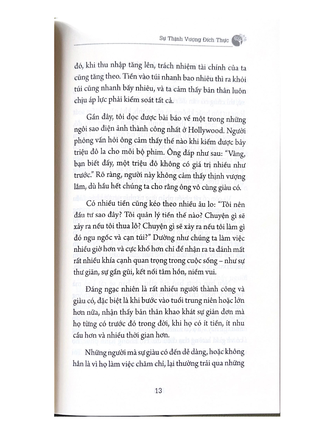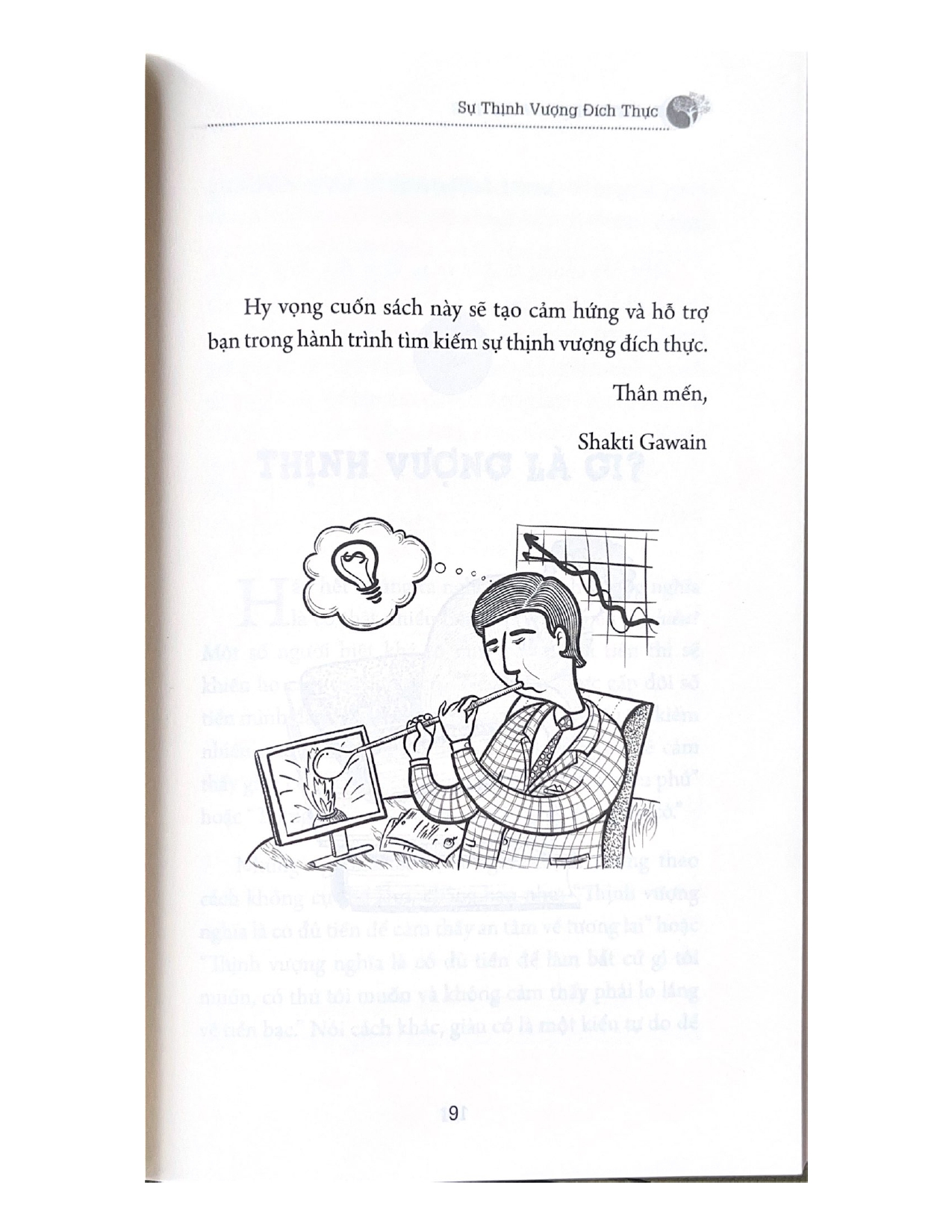 Hầu hết mọi người đều đánh đồng sự thịnh vượng với tiền bạc – nếu có thêm tiền trong túi hoặc tài khoản, họ sẽ thịnh vượng và giàu sang. Với cái nhìn mới mẻ, đổi mới về sự tự thỏa mãn, Shakti Gawain cho ta thấy những cạm bẫy trong cách tư duy này – dù giàu có đến đâu, cuối cùng, người ta rồi sẽ nhận thấy rằng, tiền bạc không thể đem đến cho họ sự viên mãn đích thực.