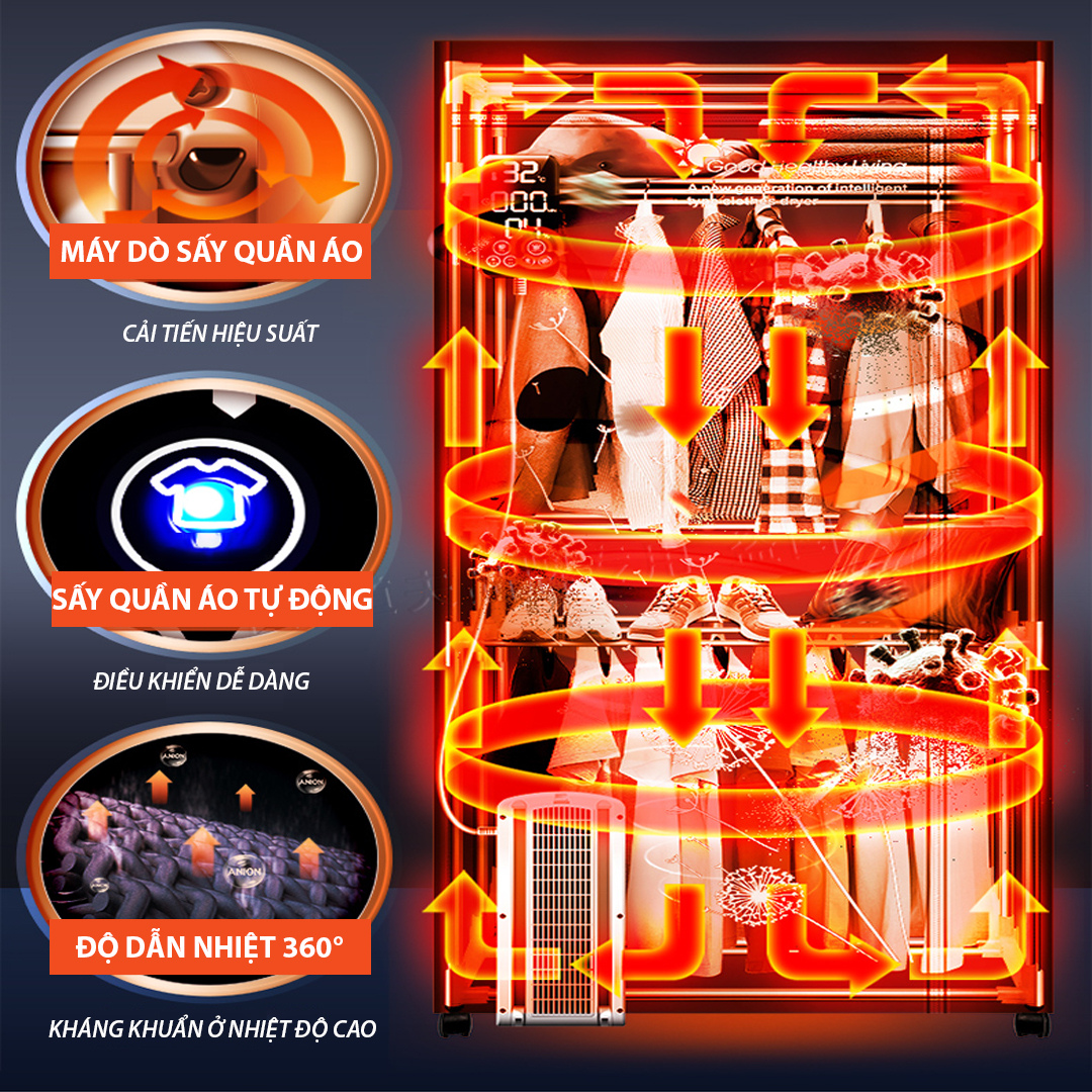 ĐẶC ĐIỂM NỔI BẬT: - Công dụng: làm khô nhanh quần áo, loại bỏ mùi hôi khó chịu, bụi bẩn trên quần áo. - Sử dụng bộ phát điện ổn định PTC, tiết kiệm điện. -