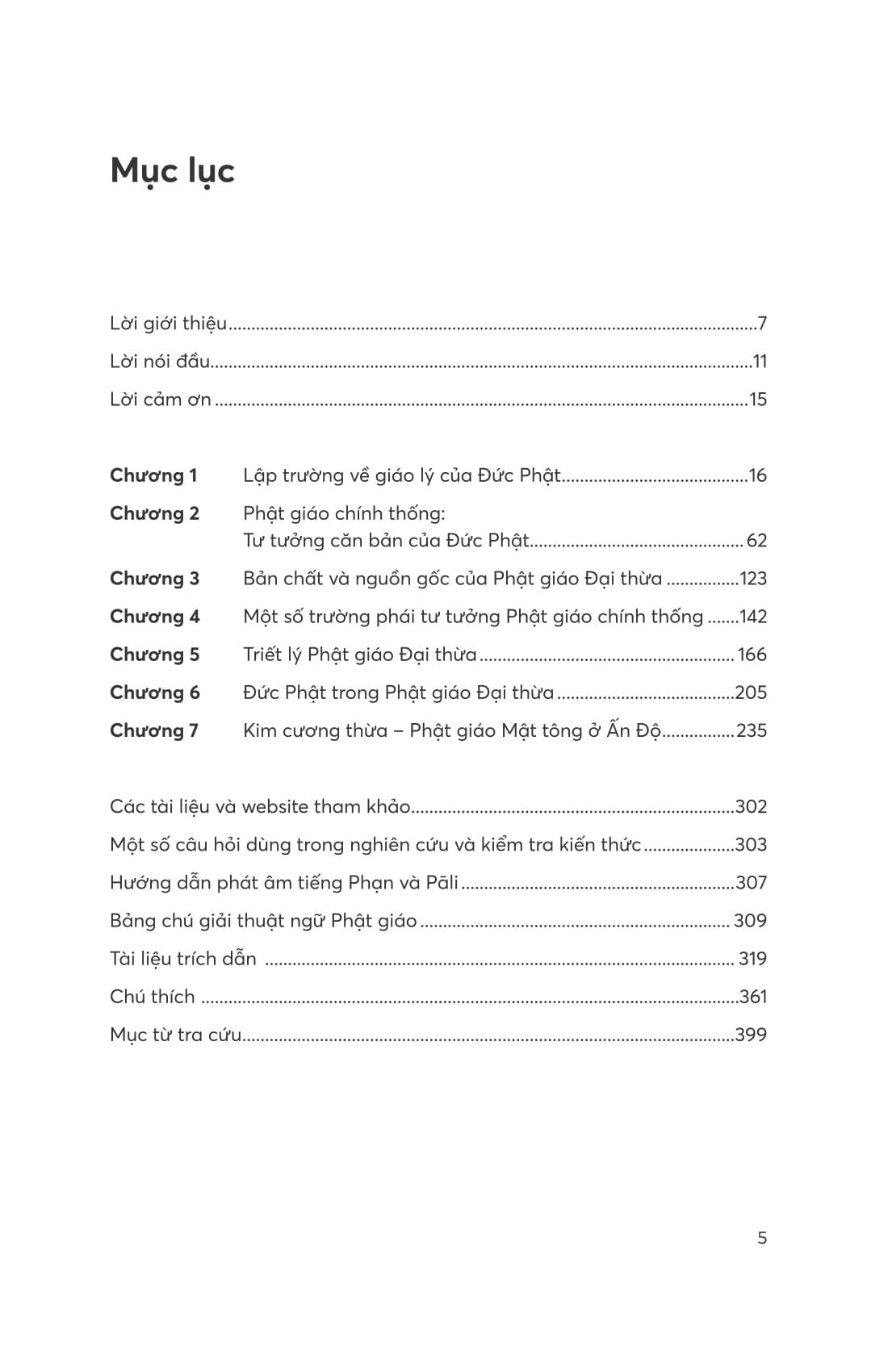 Sách bao gồm các chương về lập trường giáo lý của Đức Phật, tư tưởng chính của Đức Phật, bản chất và nguồn gốc của Phật giáo Đại thừa, một số trường phái tư tưởng Phật giáo chính thống, triết lý Đại Thừa, Đức Phật trong Phật giáo Đại thừa, và Mật tông/Kim cương thừa ở Ấn Độ.