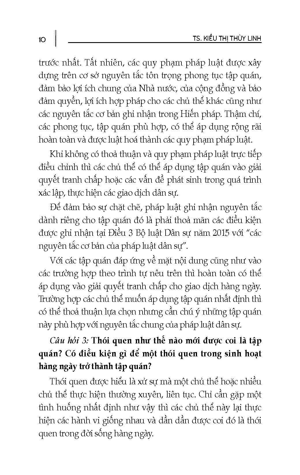 Cuốn sách trọng tâm giới thiệu về tập quán được pháp luật thừa nhận với tư cách là một nguồn quan trọng trong giải quyết các tranh chấp phát sinh. Thông qua các tình huống, câu hỏi, tác giả muốn giới thiệu những khía cạnh lý luận, làm rõ các điều kiện pháp luật đặt ra để áp dụng tập quán cũng như cho thấy vai trò tập quán trong quá trình giải quyết các tranh chấp của đời sống con người, đặc biệt những tranh chấp dân sự phát sinh trong đời sống hàng ngày. Đồng thời, tác giả cũng đưa ra các khía cạnh để đối sánh giữa tập quán với phong tục, luật tục, thói quen ứng xử.