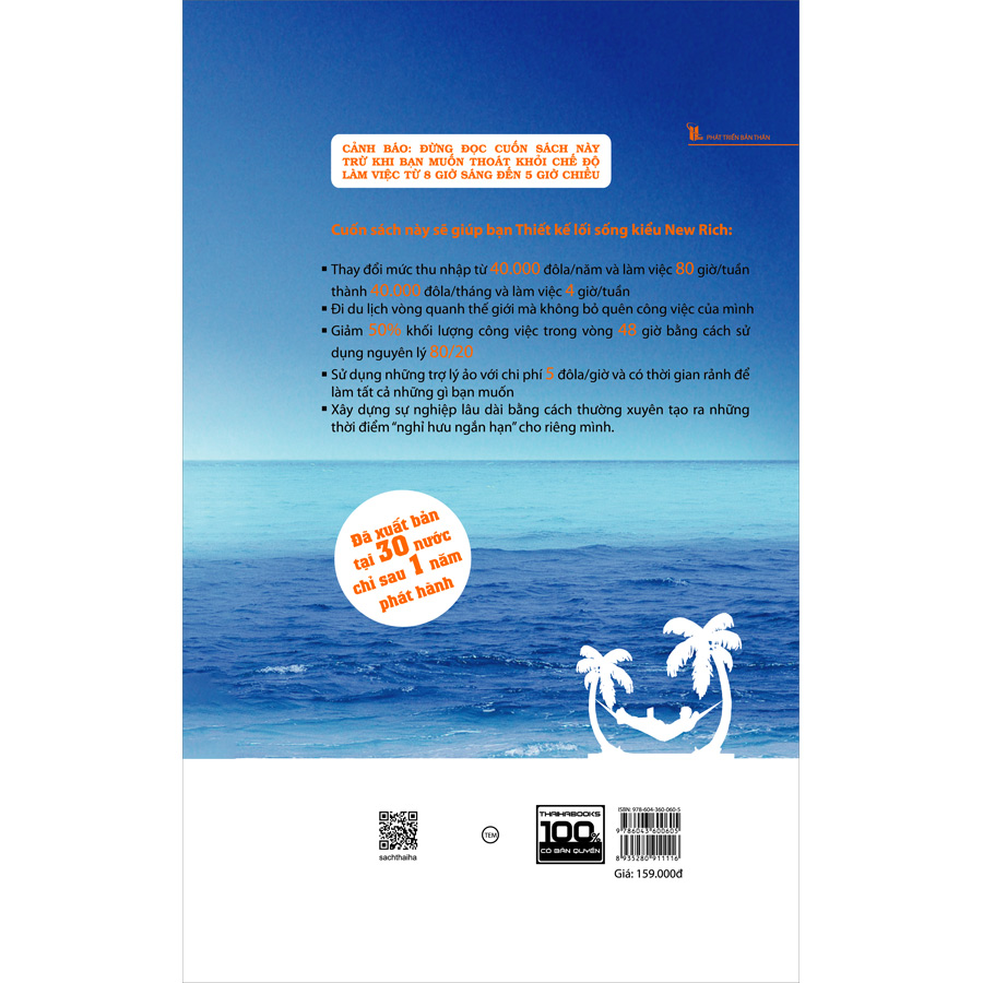 Trong cuốn sách này, Tim sẽ chỉ cho chúng ta thấy Làm thế nào để có được lối sống hoàn toàn tự do của một triệu phú mà không cần phải có 1 triệu đô la? Chỉ có một câu trả lời đơn giản, anh đã biết tách biệt thu nhập với thời gian và tạo ra lối sống lý tưởng cho mình, đi du lịch vòng quanh thế giới và tận hưởng những điều thú vị nhất trên hành tinh này. Và Tim còn chỉ cho bạn anh đã làm như thế nào để từ làm việc 14 giờ/ngày và kiếm 40.000 đô-la/ năm thành làm việc 4 giờ/ tuần và kiếm 40.000 đô la/ tháng?