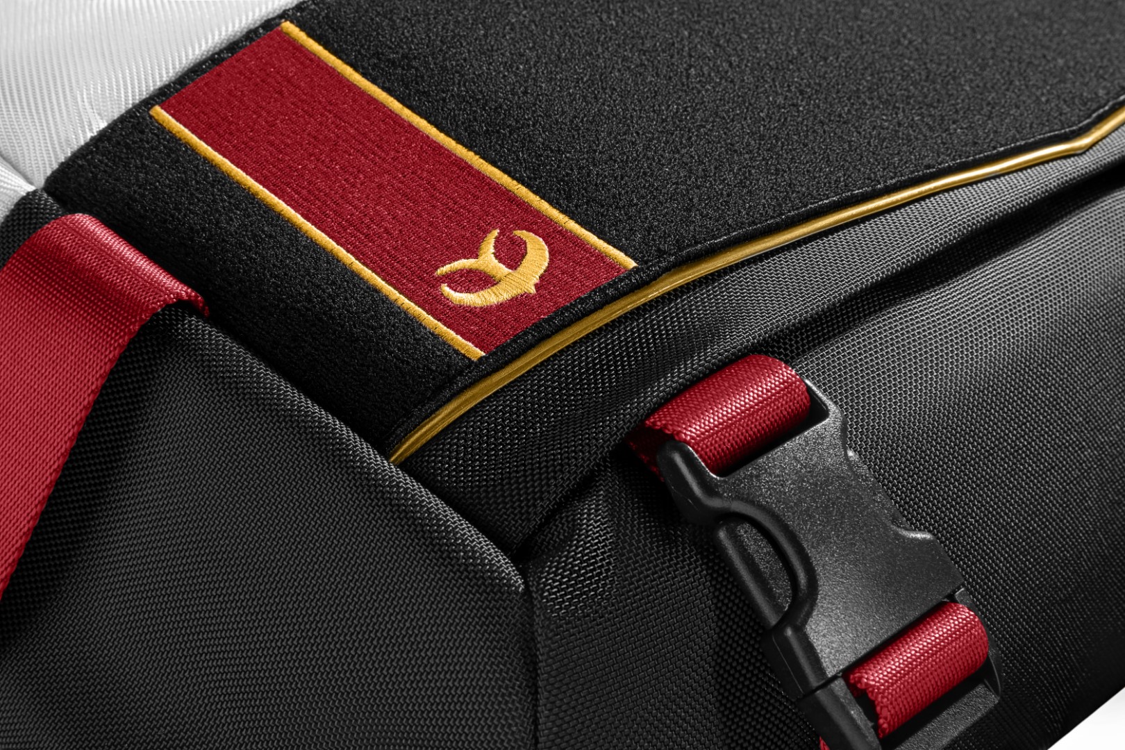 Mỗi yếu tố, kể cả dây đeo vai, đều có màu sắc đỏ và đen tượng trưng cho lòng dũng cảm không thể sánh bằng của các hiệp sĩ chiến đấu với quái vật!