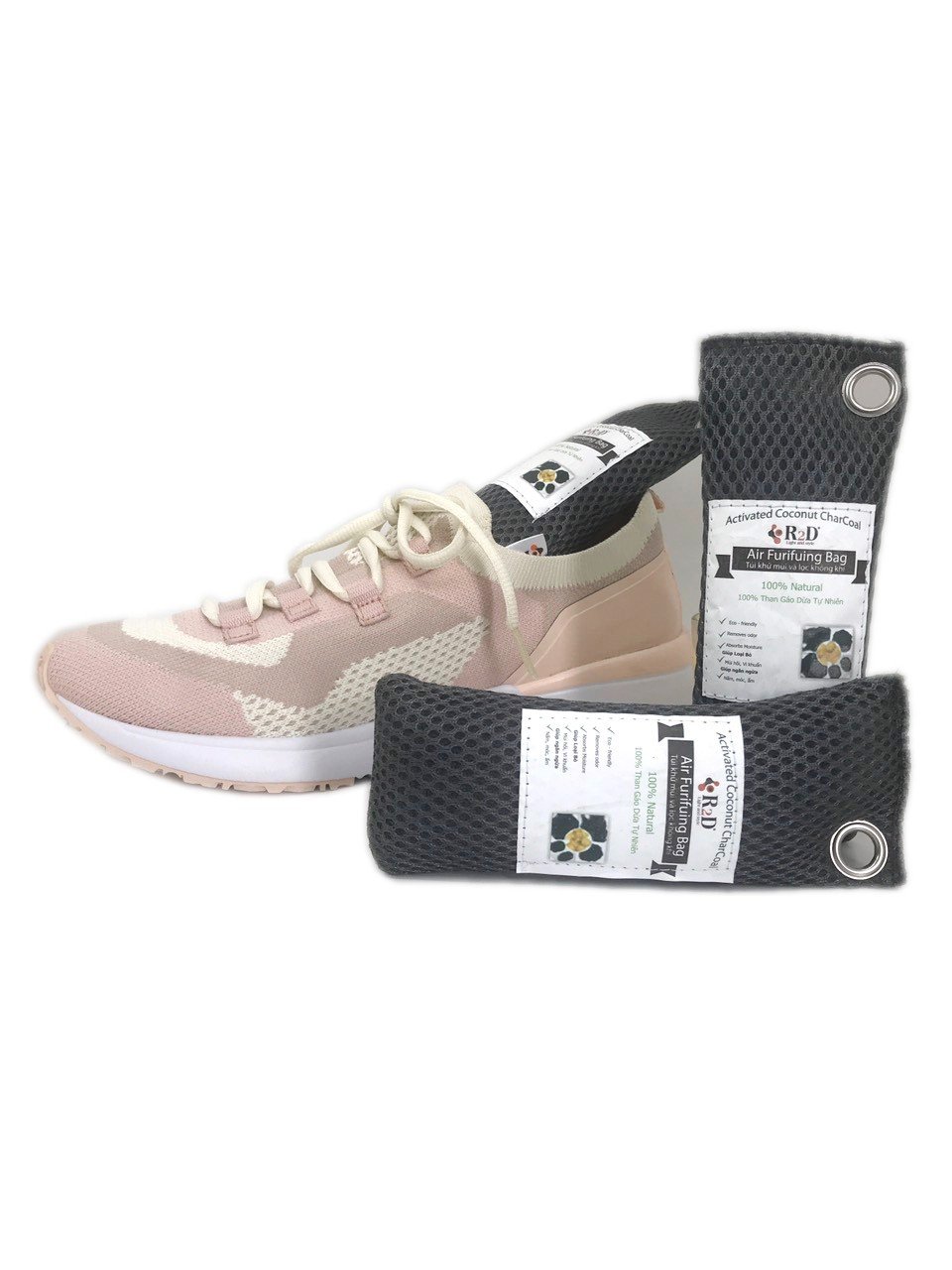 Trên tay hai túi than khử mùi giày của Hapaku, dùng ổn với mùi nhẹ, khả năng hút ẩm tốt hơn khử mùi