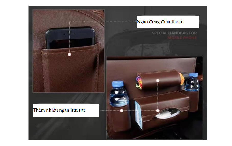 - Xuất xứ: Trung Quốc ĐẶC ĐIỂM NỔI BẬT: * Thật phiền phức vì có rất nhiều đồ đạc lặt vặt trên xe: chai nước, khăn giấy, điện thoại, sổ sách giấy tờ khắp nơi ? Làm thế nào để sắp xếp đồ đạc thật hợp lý cho các chuyến đi xa? Hiểu được vấn đề đó, chung tôi giới thiệu đến các bạn Túi đựng đồ treo sau ghế ô tô da PU cao cấp Với các ưu điểm sau: