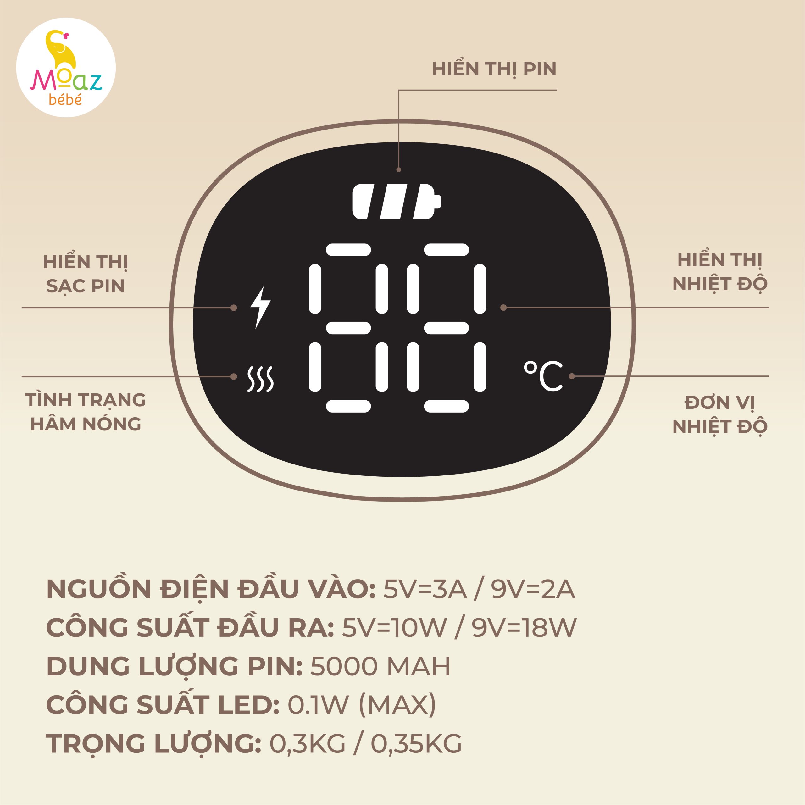 Ưu điểm túi ủ bình sữa tích điện di động Moaz MB 081 -Thiết kế nhỏ gọn, sang trọng -Chất liệu da PU và nhựa ABS an toàn, chịu nhiệt tốt -Màn hình led thông minh hiển thị chức năng, thiệt độ, dung lượng pin dễ theo dõi -Nút bấm dễ thao tác -Chế độ đèn đêm sử dụng trong điều kiện thiếu sáng -Có 6 chế độ nhiệt linh hoạt: 38/40/42/45/48/50 độ C -Có thể sử dụng liên tục trong 1 giờ hoặc trong 3 giờ ( khi sử dụng ngắt quãng) -3 loại đế tặng kèm để đặt bình sữa, phù hợp với nhiều kích thước bình cao thấp khác nhau -Có thể hâm nóng bình sữa, chai nước, cốc thủy tinh… -Có thể cắm sạc bằng nhiều nguồn điện: sạc điện thoại, sạc dự phòng, sạc xe ô tô -Vạch nhấp nháy thông báo khi dung lượng pin thấp -Bảo hành 12 tháng Thông số kỹ thuật túi ủ bình sữa tích điện di động -Tên sản phẩm Túi ủ bình sữa tích điện di động -Mã sản phẩm MB – 081 -Nguồn điện đầu vào 5V=3A / 9V=2A -Công suất đầu ra 5V=10W / 9V=18W -Dung lượng pin 5000 mAh -Công suất LED 0.1W (Max) -Trọng lượng 0,3kg / 0,35kg -Thời gian bảo hành 12 tháng