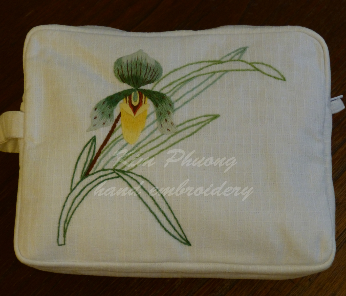 Sản phẩm Túi mỹ phẩm Mẫu LAN HÀI VÀNG Vải cotton Màu vải kem Kích thước chung rộng 16 x dài 23 x cao 7cm Hình dạng chữ nhật, có lót bên trong, dây kéo