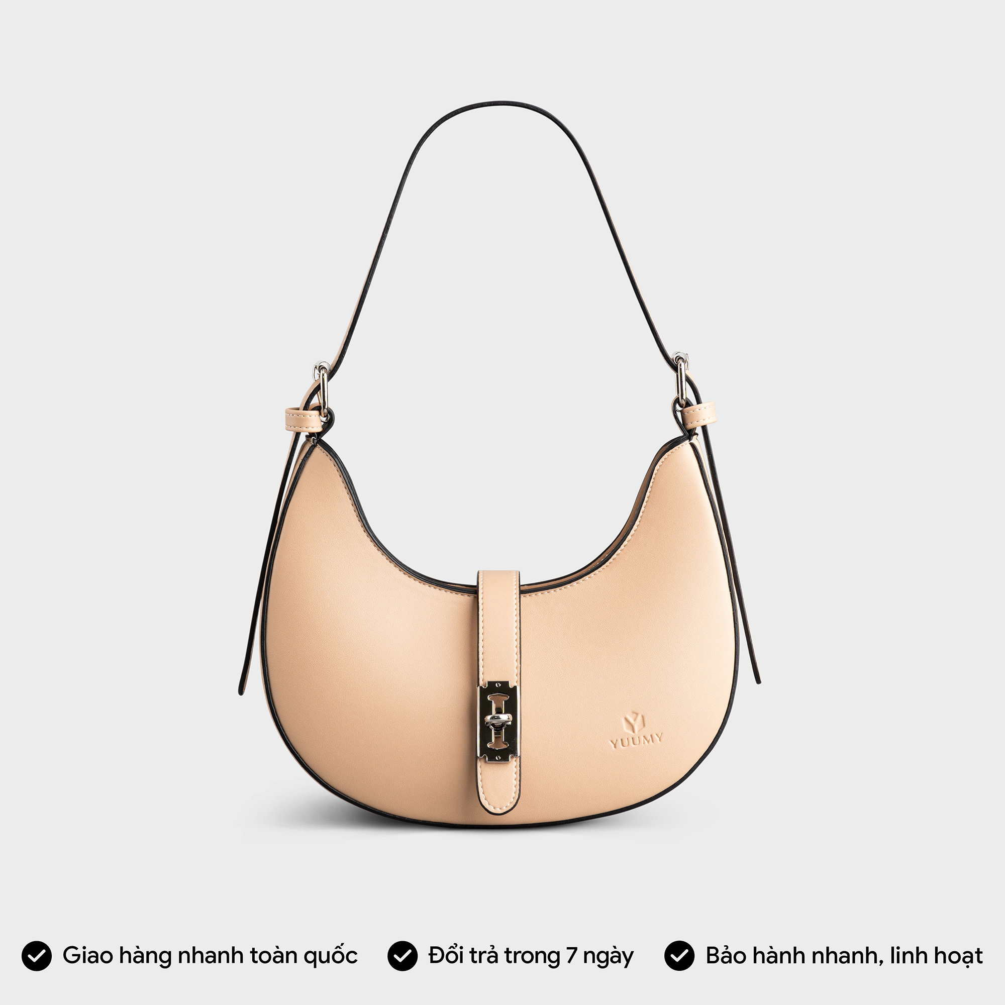 THIẾT KẾ NỔI BẬT - DÁNG CHUẨN FORM - Thiết kế túi hình bán nguyệt nữ tính, hiện đại, cùng chất liệu da chống trầy, chống bám nước. - Khóa gài trang trí cách