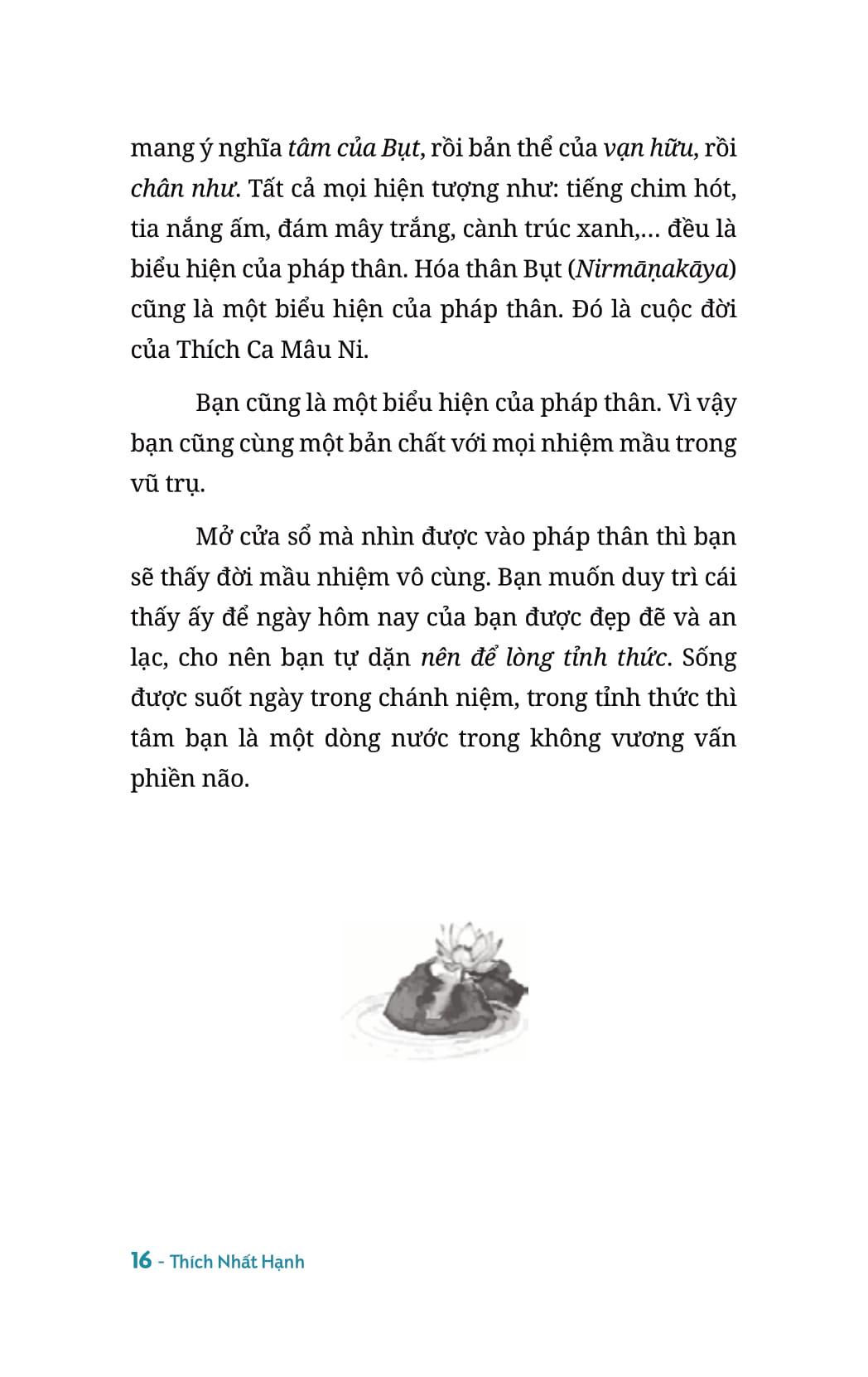 Từng Bước Nở Hoa Sen Không nhơ cũng không sạch Không bớt cũng không thêm Trí tuệ Ba La Mật Không có pháp nào trên Từng Bước Nở Hoa Sen Không nhơ cũng không sạch Không bớt cũng không thêm Trí tuệ Ba La Mật Không có pháp nào trên Sống là chuyển hóa không ngừng, tất cả mọi vật nương vào nhau để tồn tại. Thân tâm an trú trong chánh niệm thì khi đốt một lò trầm, tâm ta cũng thanh tịnh. Chấp nhận cuộc đời là chấp nhận cả sinh lẫn diệt, cả còn lẫn mất, cả vui lẫn buồn. Vì có sự sống là có chết chóc… có sum họp thì có chia lìa, có được thì sẽ mất đi… Đức Phật dạy rằng: "Cứu chữa cho tâm quan trọng hơn là cho thân, vì đó là nguyên nhân gây ra bao điều tội lỗi. Người có tâm từ bi rộng lớn và hành vi thiện lành, tâm sẽ ít bị vẩn đục bởi phiền não tham, sân, si chi phối. Nếu chúng ta mỗi ngày tỉnh giác từng ý nghĩ, lời nói và hành động của mình, thì ta sẽ biết cách làm chủ bản thân để ngày càng hoàn thiện chính mình hơn về mọi mặt." Từng bước nở hoa sen của Thiền sư Thích Nhất Hạnh là một trong những quyển sách "dạy" ta cách sống an nhiên như thế. Bốn mươi bảy bài kệ trong sách cũng là bốn mươi bảy bài học giúp ta tu tập chánh niệm mỗi ngày, hướng đến sự an lạc trong cả tâm, thân và sống hết mình cho từng giây phút hiện tại.