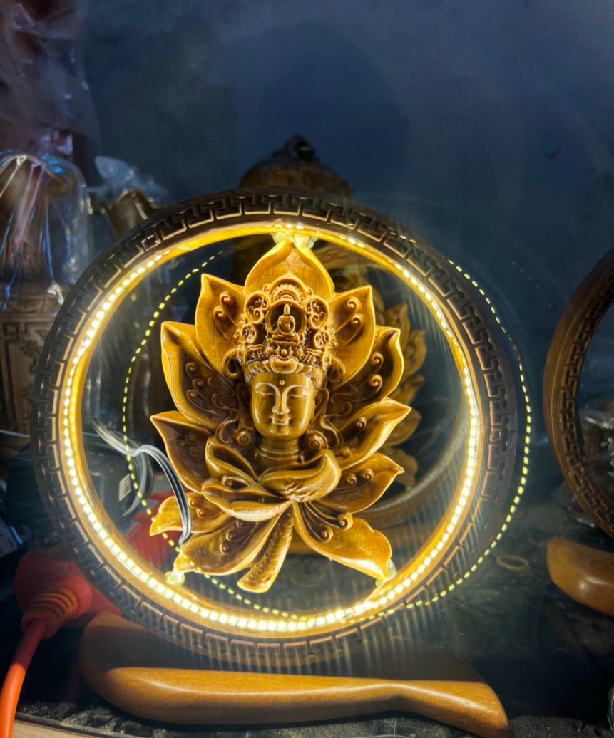 Mua tại TiktokDiện phật được làm bằng chất liệu gỗ hương đá tự nhiên 100% Kt tròn 20×20×6cm _ Diện phật được trạm khắc tỉa mỉ ,tinh sảo kỳ công à được lắp thêm bóng đèn viền thắp sáng lúc tối ,Đi hầu hết tất cả mọi chi tiết góc ngách nội dung hoa văn của tượng đều được gọt tỉa chỉnh sửa hoàn toàn bằng tay thủ công .Diện phật được làm và hoàn thiện do bàn tay khối óc tài hoa .Từ những người thợ dầy dặn kinh nghiệm cũng như tay nghề cao trong làng nghề truyền thống .Chính vì thế diện phật bằng gỗ hương đã đáp ứng đầy đủ mọi tiêu trí cần thiết như ,( Đẹp bền rẻ ) Thẩm mỹ nghệ thuật với chất lượng tuyệt vời