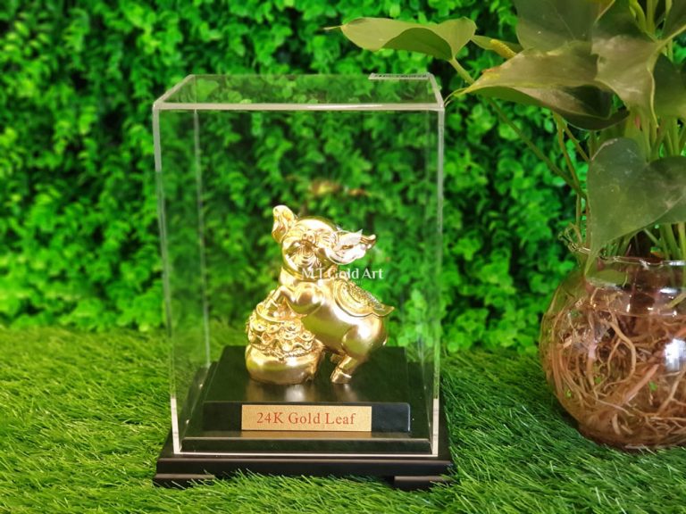 Tượng heo dát vàng 24k là sản phẩm quà tết độc đáo, sang trọng, ý nghĩa. Với hình ảnh chú lợn đang thong dong đi trên đống tiền là biểu trưng cho một năm mới nhiều tiền tài, may mắn, cuộc sống an nhiên. Chú heo là biểu tượng của tuổi hợi và được gọi là con lợn vàng mang đến may mắn, tài lộc. Tượng heo dát vàng 24k là món quà tết sang trọng, ý nghĩa tặng khách hàng, bố mẹ…