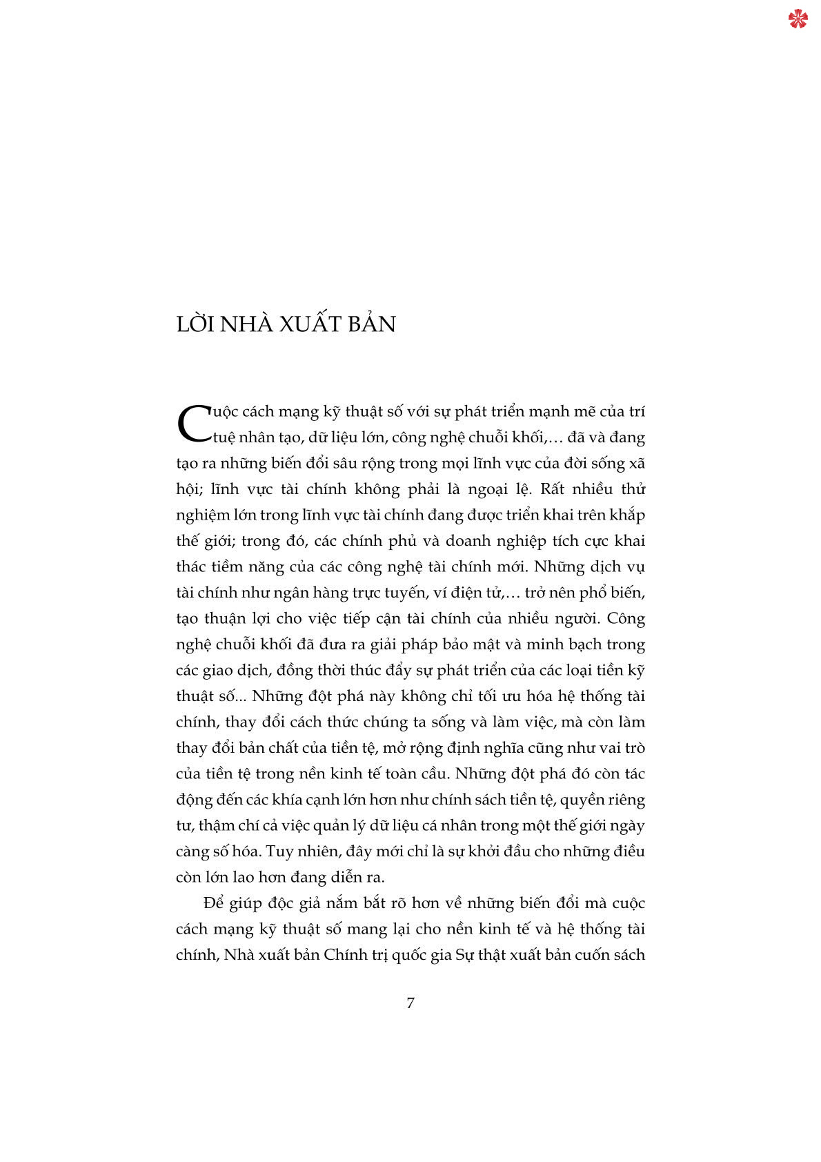 Cuốn sách cung cấp cái nhìn tổng quan về sự trỗi dậy của các đồng tiền kỹ thuật số, cùng với công nghệ tài chính và công nghệ chuỗi khối - những yếu tố đang thách thức và tái định hình hệ thống tài chính truyền thống. Đồng thời, làm rõ sự phát triển của tiền kỹ thuật số của ngân hàng trung ương (CBDC) được coi là một bước tiến lớn trong việc cải thiện hệ thống thanh toán và thúc đẩy tài chính toàn diện.