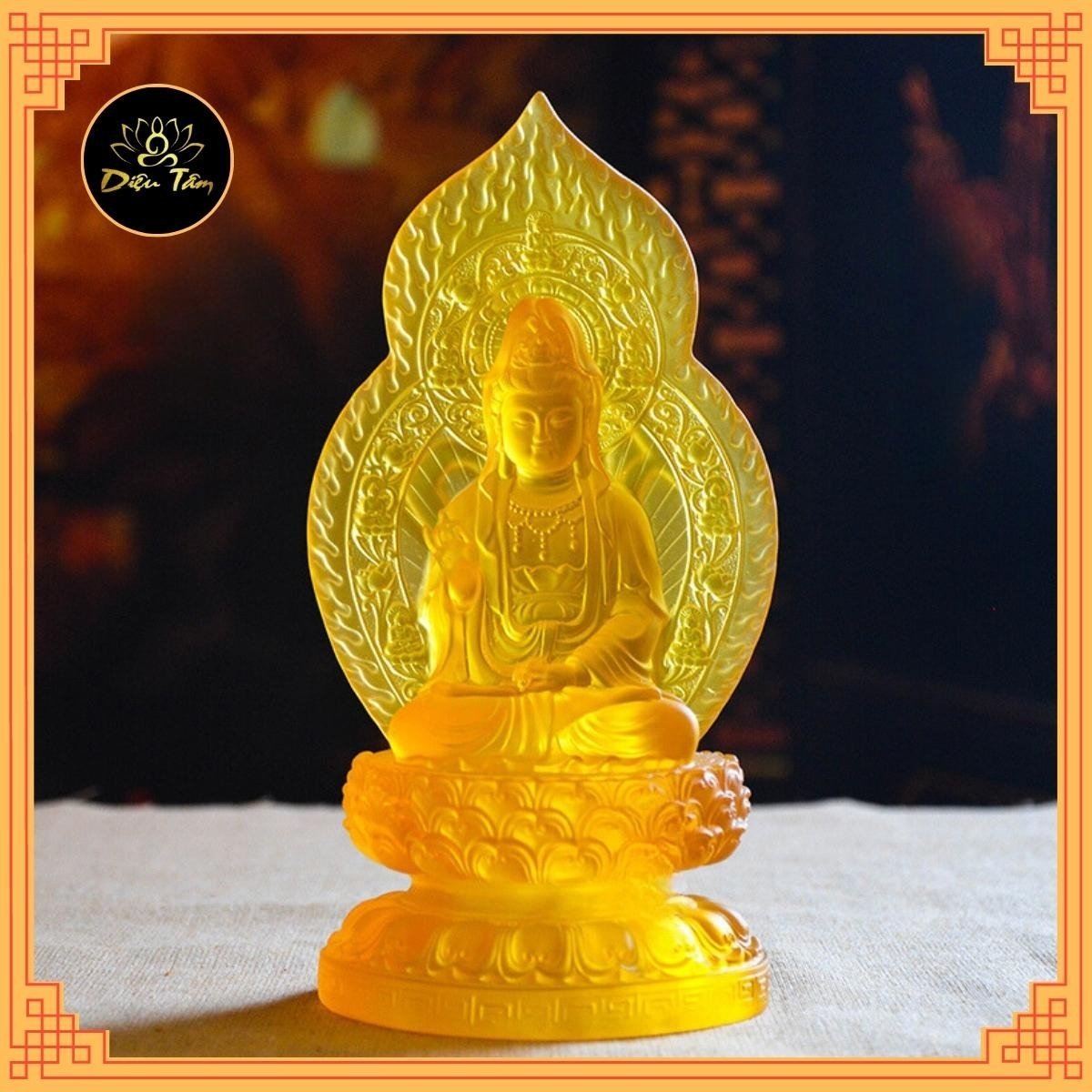 Tượng Phật Quan Âm Đá Lưu Ly Vàng Mới để trong xe hơi hoặc để bàn cao 12cm đk 7cm đế 5cm Mệnh Kim mệnh Thổ mệnh Thủy ạ *** Tượng Phật Quan Âm Đá