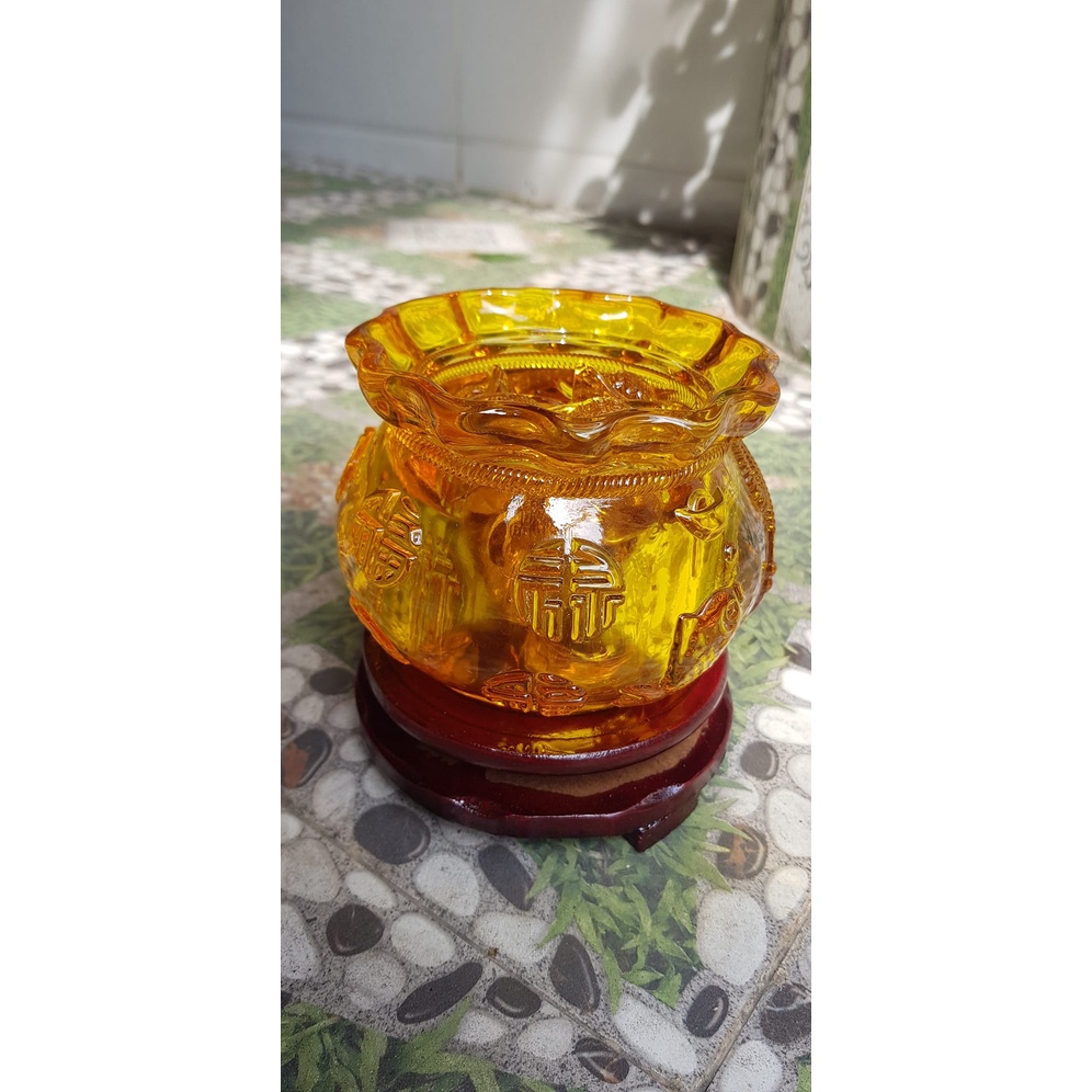 Thố tụ tài to mới miệng kiểu màu vàng anh tài lộc 20 thỏi xiền vàng đá lưu ly tự nhiên đế gỗ Size lớn đk 13cm x Cao 13cm cả đế x thố cao 9cm