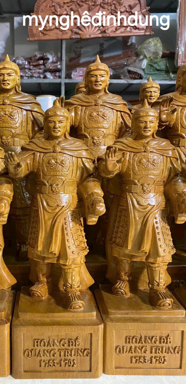 Tượng vua hoàng đế quang trung được làm bằng chất liệu gỗ bách xanh liền khối tự nhiên 100% Kt cao 40x13x11cm _ Tượng được chạm khắc vô cùng tỉ mỉ tinh xảo kỳ công. ĐI HẦU tất cả mọi chi tiết góc ngách nội dung hoa văn của Tượng đều được gọt tỉa chỉnh sửa sắc nét hoàn toàn bằng tay thủ công truyền thống.