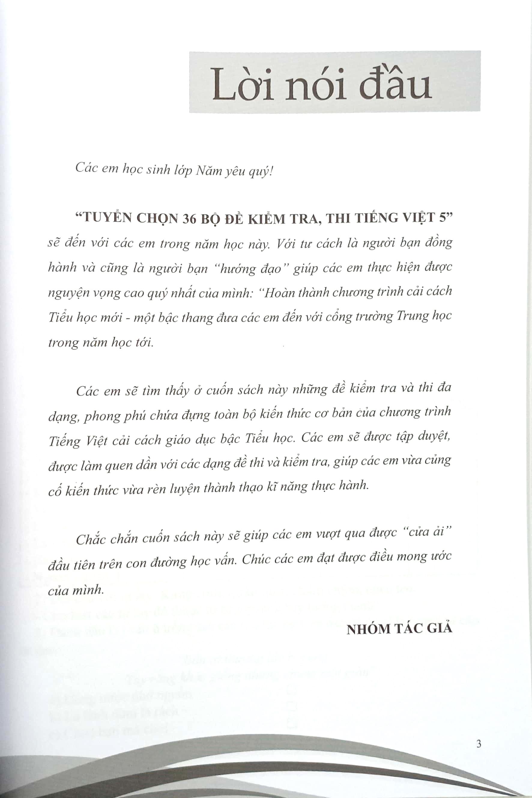 Cuốn sách Tuyển Chọn 36 Bộ Đề Kiểm Tra Thi Tiếng Việt 5 được biên soạn với mục đích giúp các em có tài liệu luyện tập, thực hành làm bài tập Tiếng Việt, thực hành viết đoạn văn, cảm thụ thơ văn.
