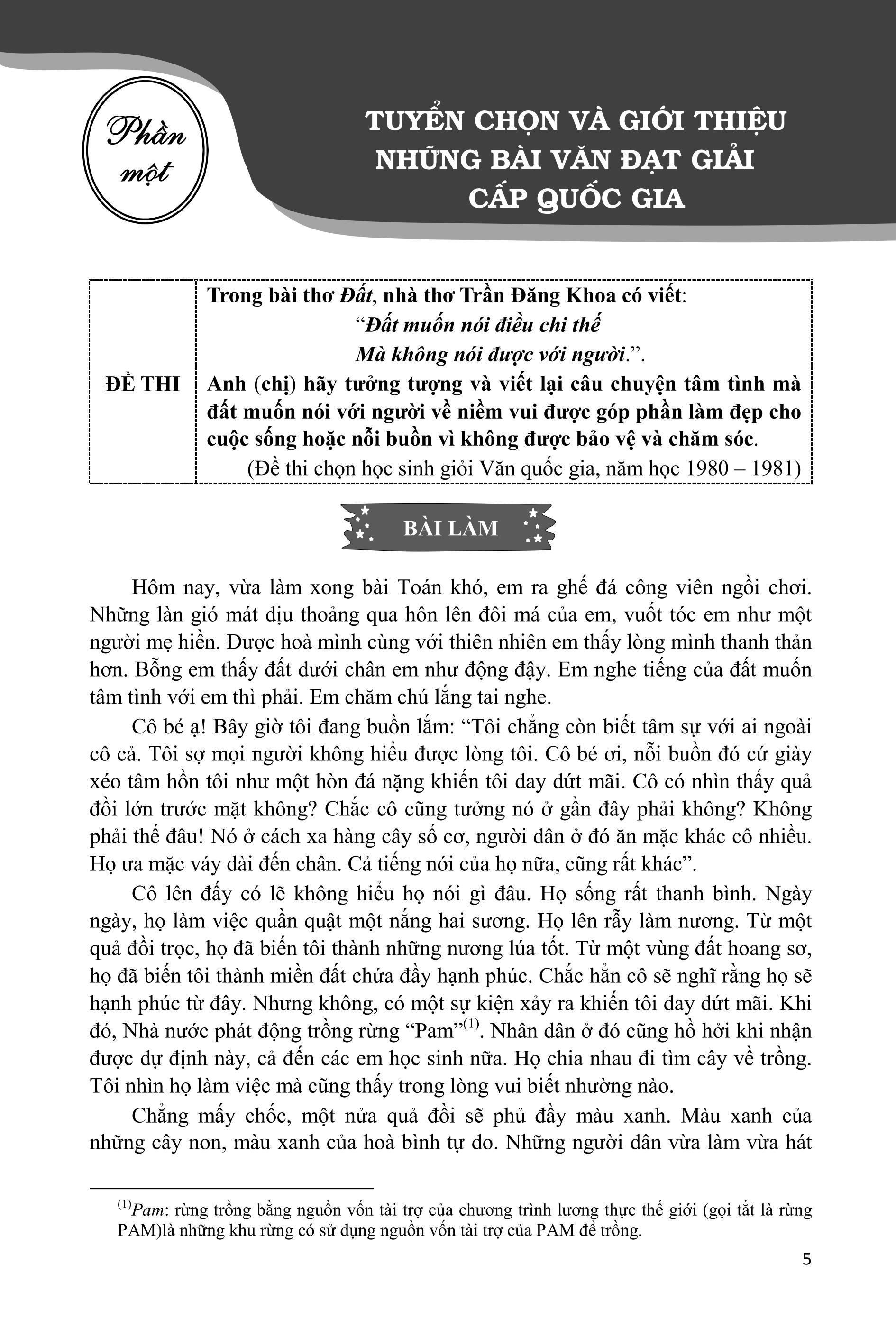 Phần thứ 2: Tuyển chọn những đề và bài làm văn của học sinh giỏi Cuốn sách không chỉ cung cấp các đa dạng đề, những bài làm văn hay, nâng cao, mở rộng kiến thức mà còn tính giáo dục cao.