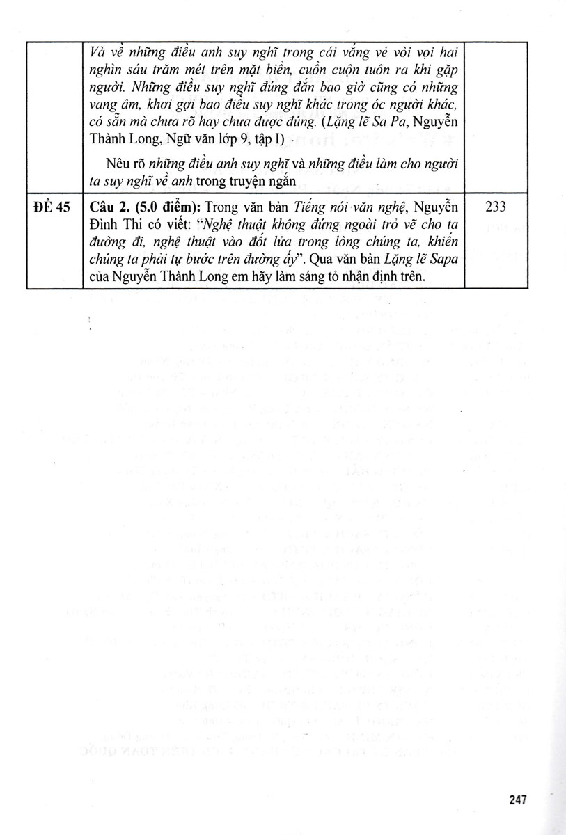 Bố cục sách gồm 45 đề thi và hướng dẫn chấm theo cấu trúc mới của Bộ Giáo dục và Đào tạo quy định. Các ngữ liệu của đề thi được lấy trong hoặc ngoài chương trình sách giáo khoa giúp thầy cô và các em được tiếp cận nhiều với những vấn đề thực tiễn để giải quyết các tình huống đa dạng trong cuộc sống.