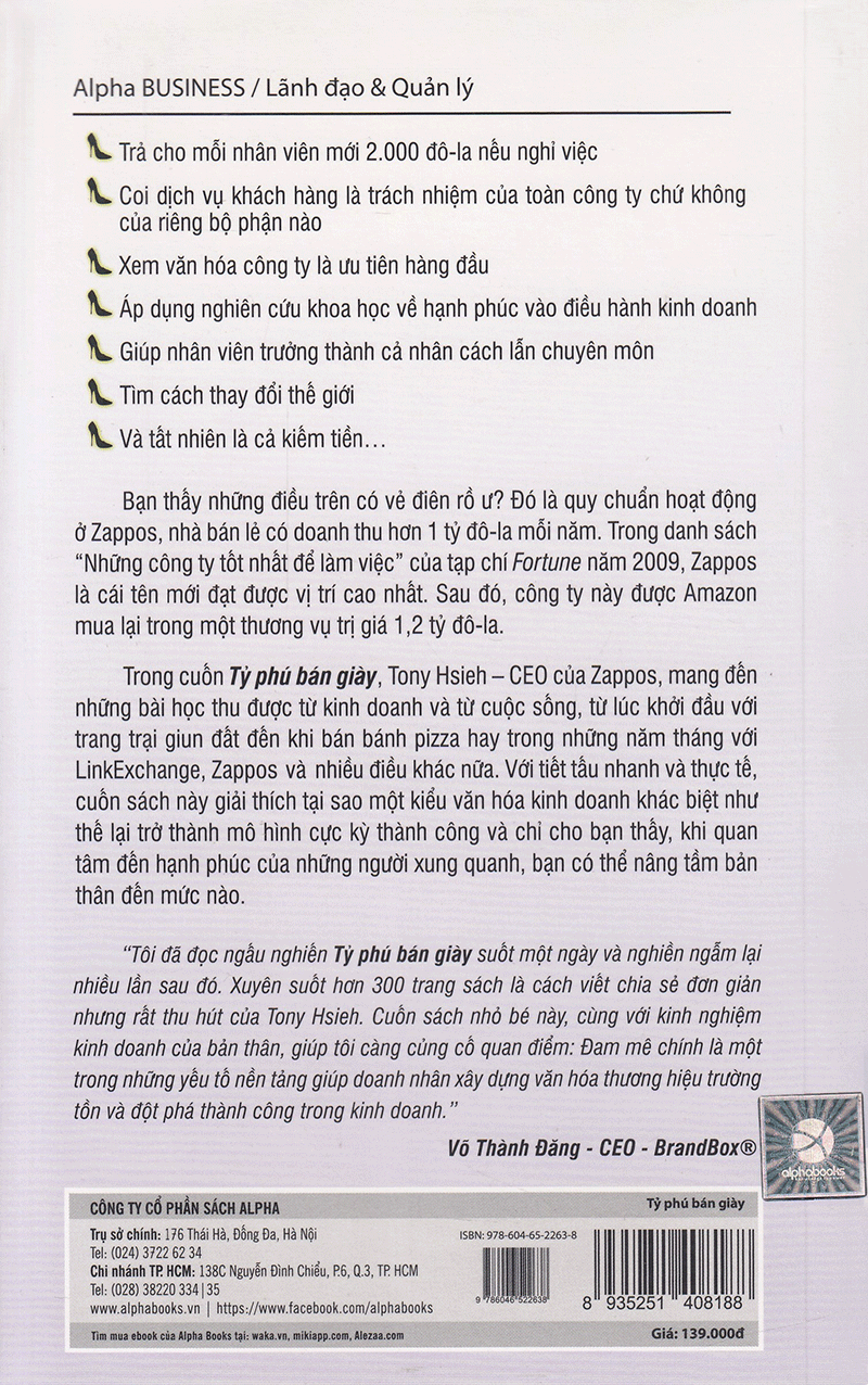 Với Tỷ phú bán giày, người đọc sẽ nhận được cảm hứng, nhiệt tình và cả một chút điên rồ cho những ý tưởng kinh doanh mà nghe qua tưởng như rất liều mạng. Nhưng với Zappos, Tony Hsieh đã tạo dựng được một thương hiệu về "văn hóa công ty" - chìa khóa thành công để theo đuổi một môi trường làm việc năng động và những dịch vụ xuất sắc.