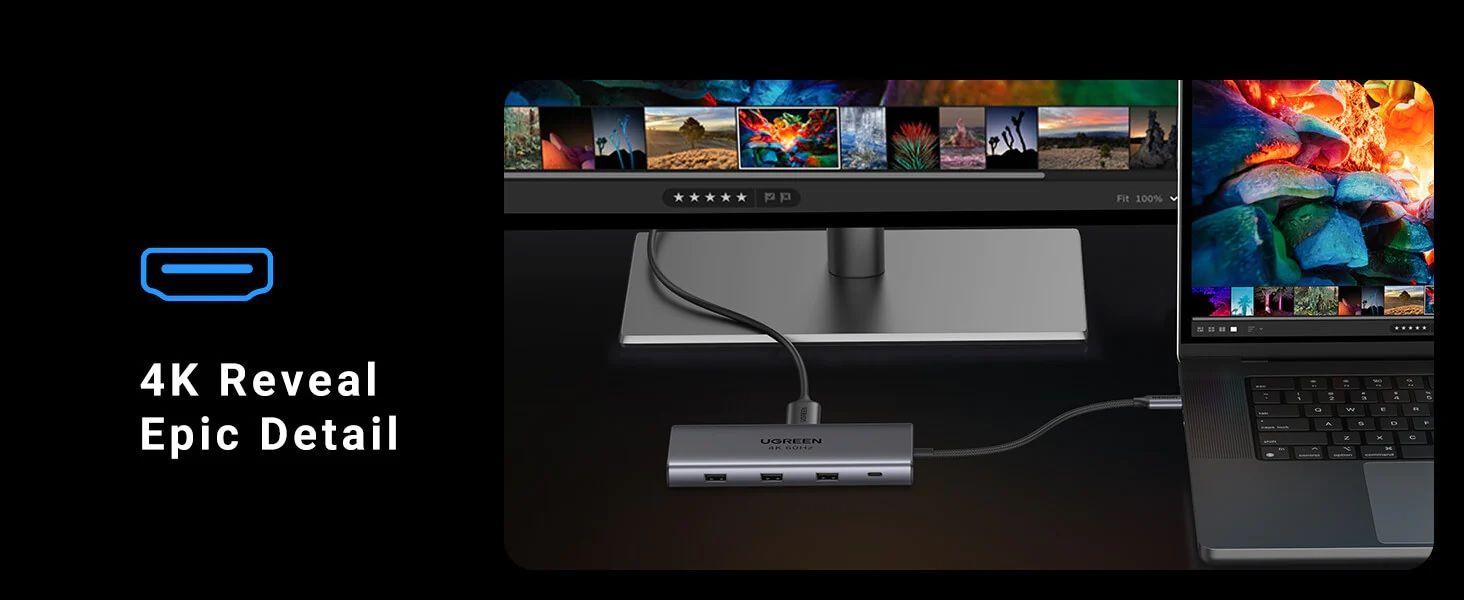 1. Hãng : Ugreen 2. Mã sản phẩm : 70495 – CM136 3. Màu : Xám 4. UGREEN Loại C Thunderbolt 3 được thiết kế với một cổng HDMI 4k ở 30Hz, 3 cổng USB
