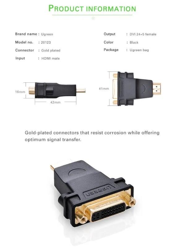Ugreen 20123 1080P HDMI Male To DVI 24+5 Female Adapter Gold Connector 1. HDMI adapter dvi vga adapter connector converter - HDMI male to DVI female adapter 2. Color: Black 3. 100 g 4. 12