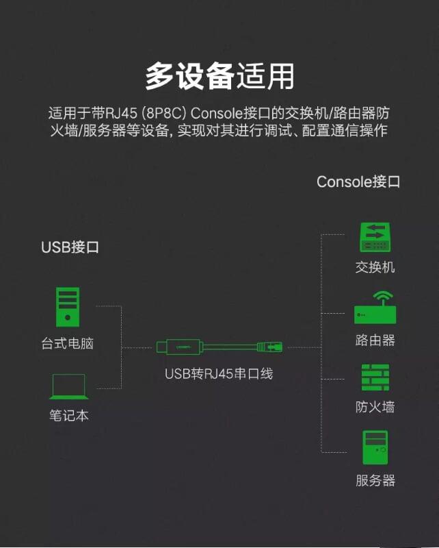Ugreen 50773 1.5m usb to rj45 console cable black cm204 1. USB to RJ45 Console Cable can connects your computer or laptop's USB port to your modern router firewall switch or other device with a