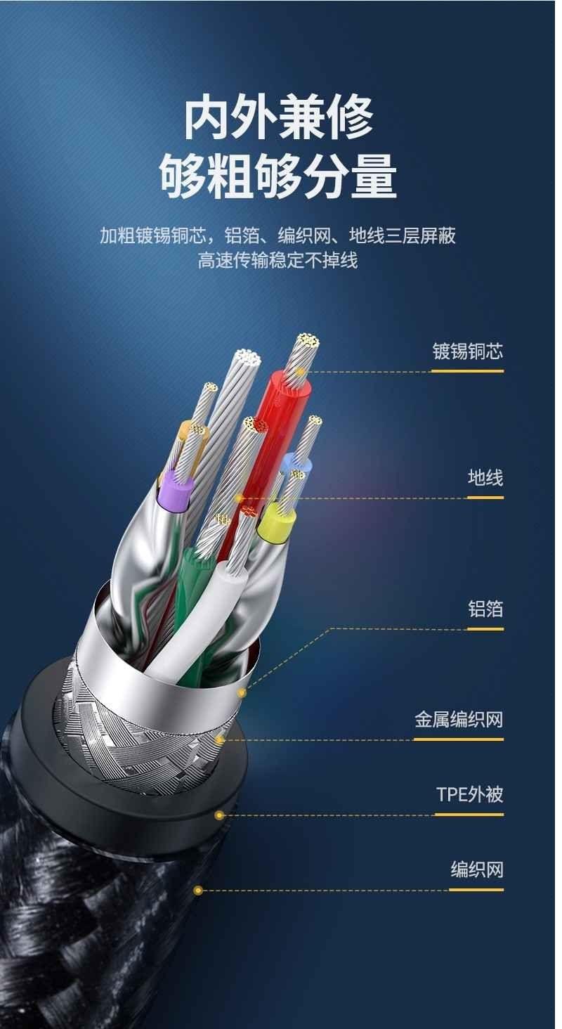 1. Corrosion-resistant tinned copper conductors provide effective conductivity; Aluminum foil and ground wire double shielding minimize data loss. 2. Molded strain relief and TPE jacket make the cable bend flexibly providing reliable performance in durable