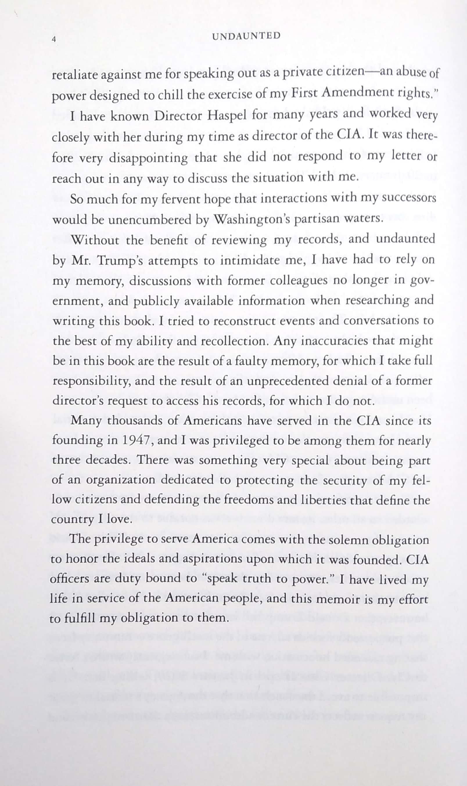 Undaunted: My Fight Against America’s Enemies, at Home and Abroad offers a rare and insightful look at the often-obscured world of national security, the intelligence profession, and Washington’s chaotic political environment. But more than that, it is a portrait of a man striving for integrity; for himself, for the CIA, and for his country.